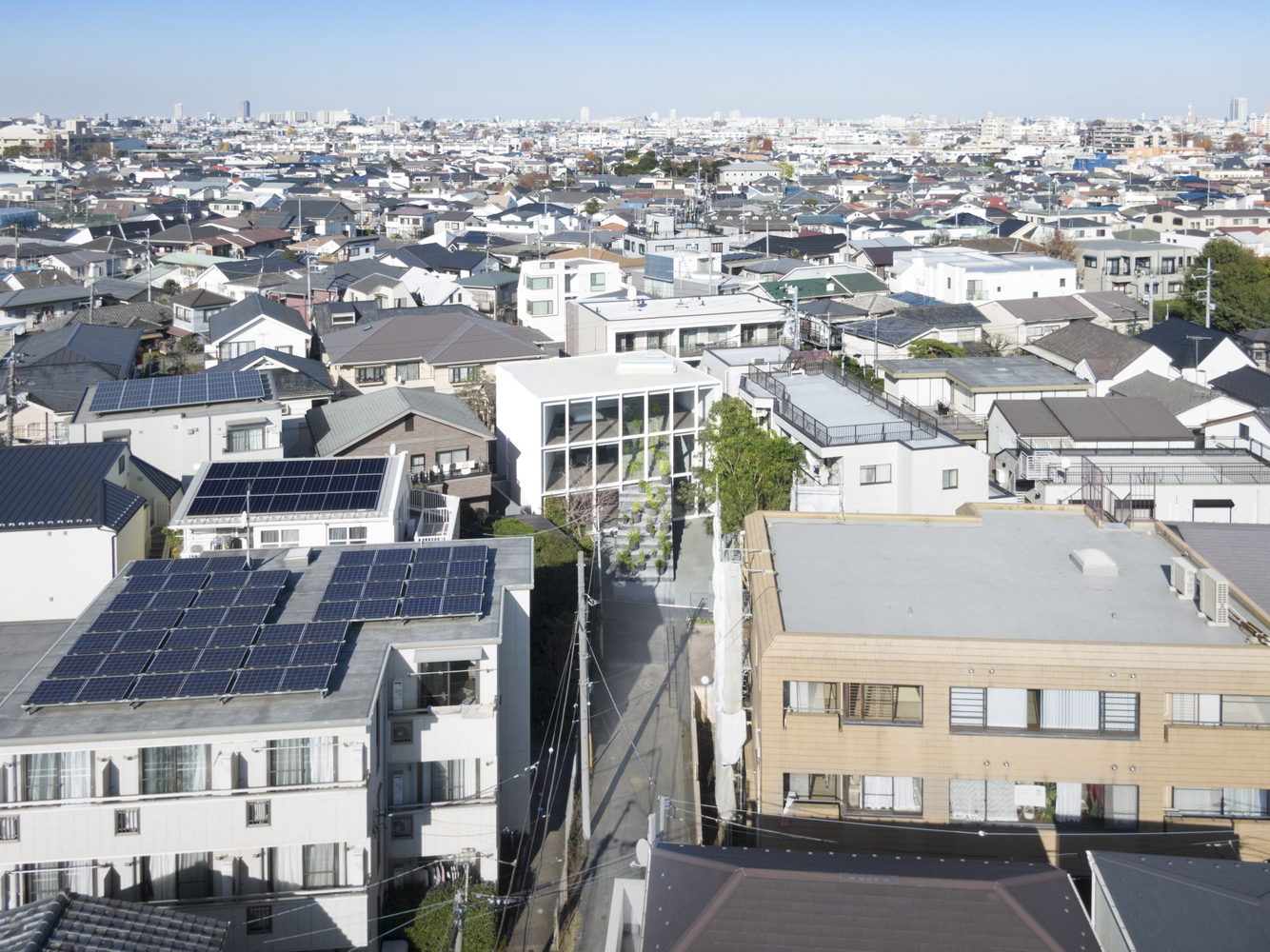 A two-family home in a quiet residential area of Tokyo. With other houses and apartment buildings pressing around the site, the architectural volume was pushed to the north to take in daylight, ventilation, and greenery of the yard into the living environment by a large glass front southern façade.