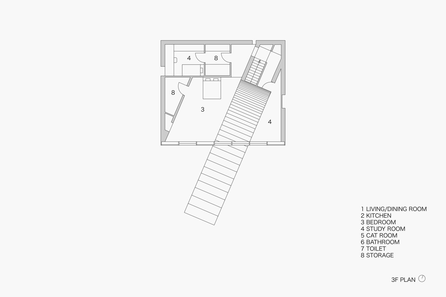 Not only does the stairway connect the interior to the yard, or bond one household to another, this structure aims to expand further out to join the environs and the city —connecting the road that extends southward on the ground level, and out into skylight through the top-light.