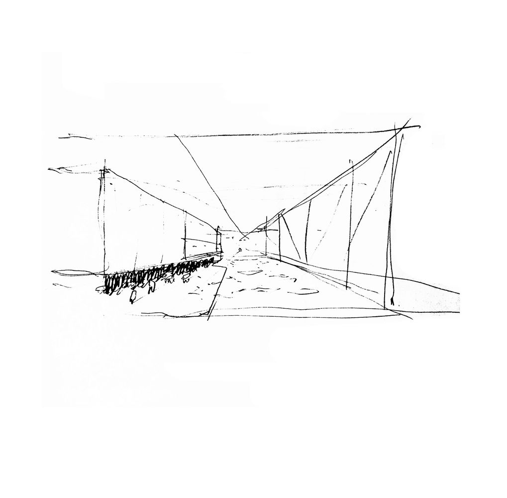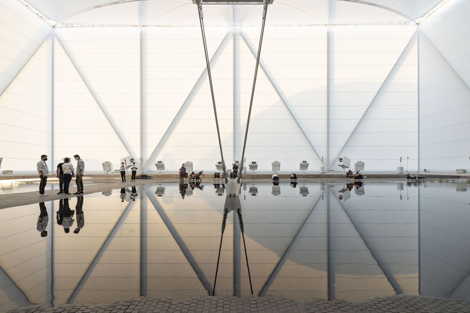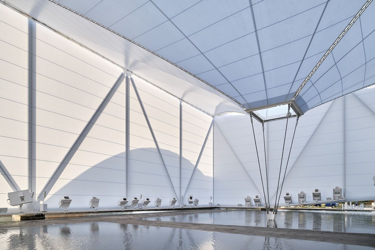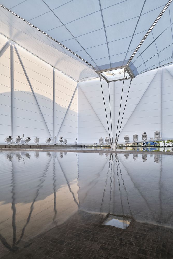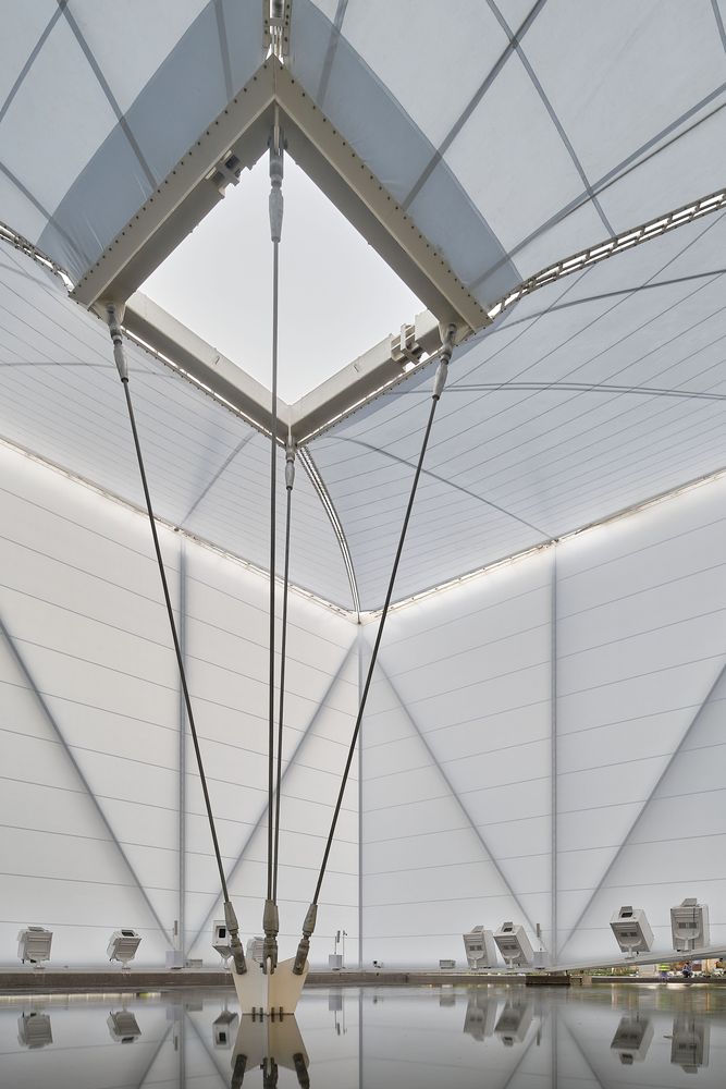 The fabric is reinforced with steel cables that form the ridges of the impluvium and which, passing through a traction ring are taken down and tied at a single point to the ground, inside the water mirror. The resulting geometry, as in any tensile structure consisting of elastic elements, is not entirely flat, with the ridges curving upwards from their center (along with the steel cables) with a curve of the order of 5 percent along their length, while the fabric tensioned between the cables curves almost imperceptibly downwards.