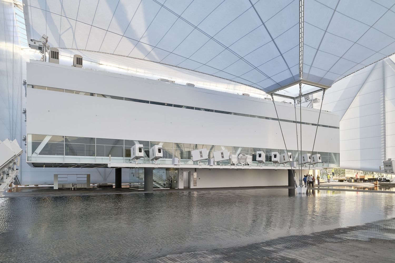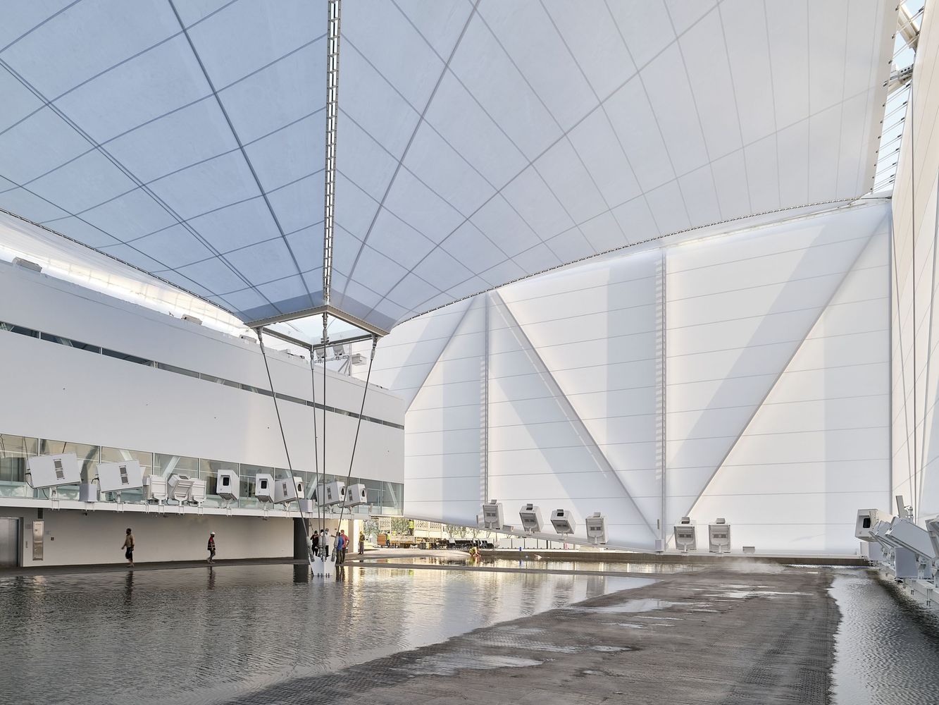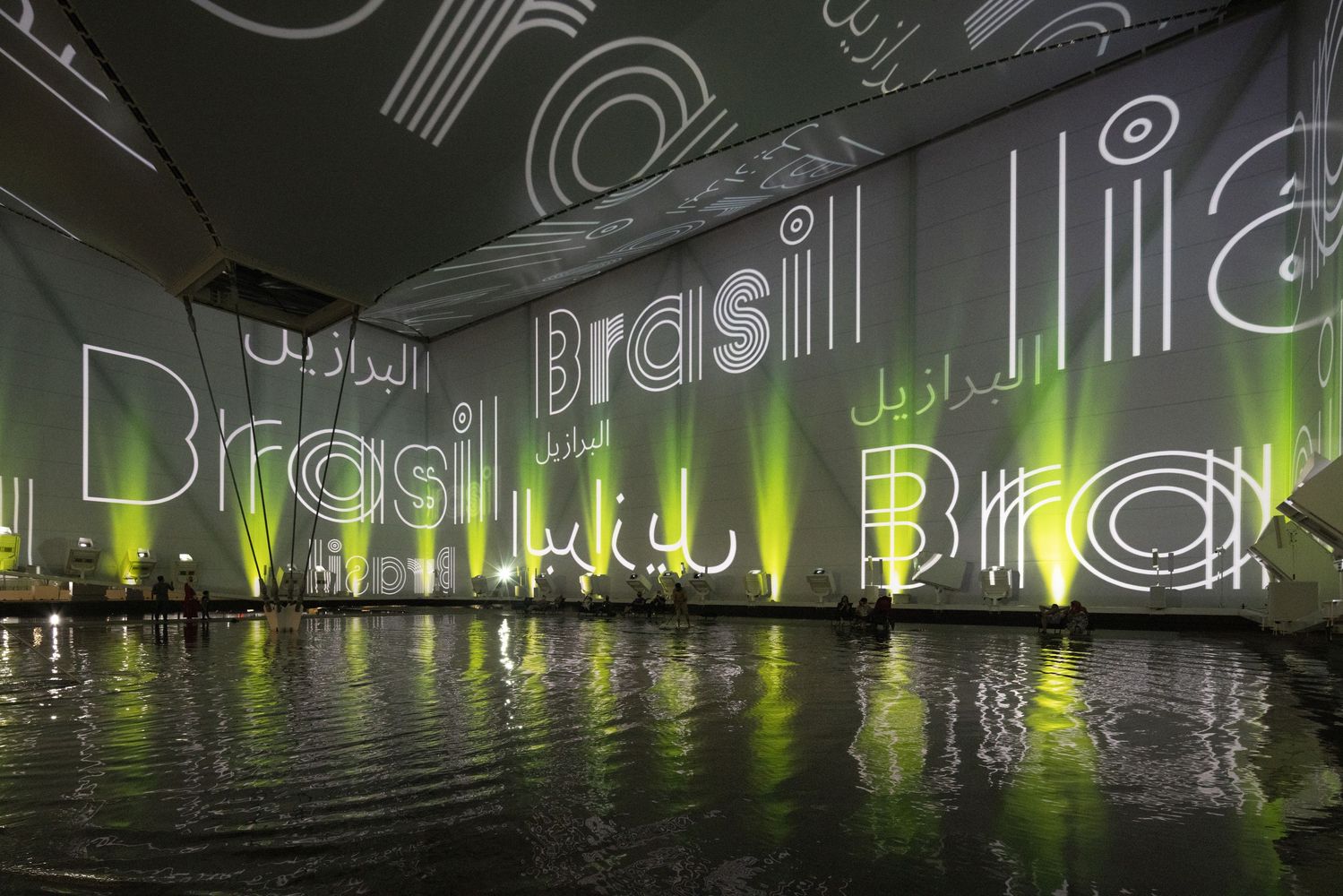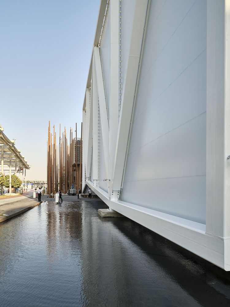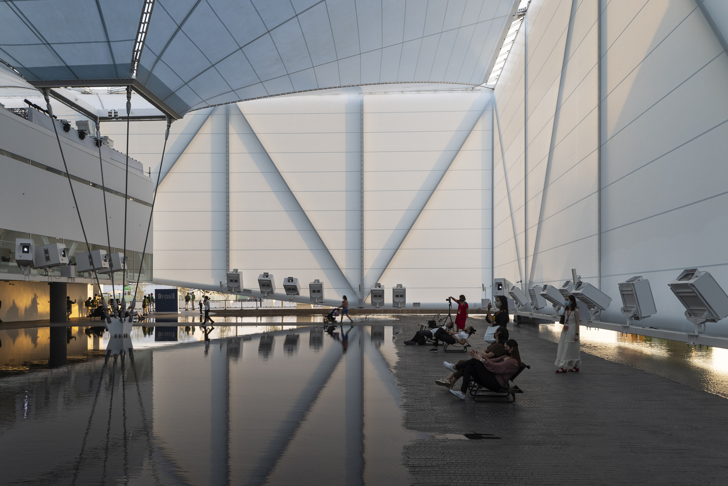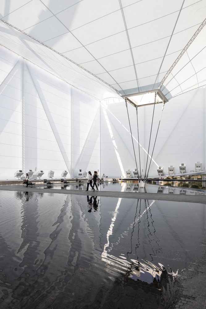 The pavilion features the waters of Brazil - its rivers and mangroves, the birthplace of the fertility of life, a natural inheritance that underlies all discourse about sustainability on the planet. With its tensile steel structure and lightweight white fabric, the pavilion is a fabric onto which videos are projected, creating an immersive atmosphere of variable images, sounds, aromas, and temperatures, over an area of undulating, shallow water through which the pavilion’s visitors may walk. It is a place of interaction, of an arresting scenic character. It is a stage for the visualization of nature and culture focused both on preservation and on a future made sustainable through technology.