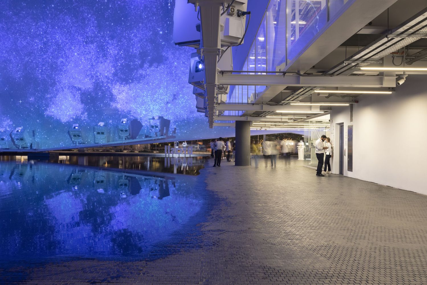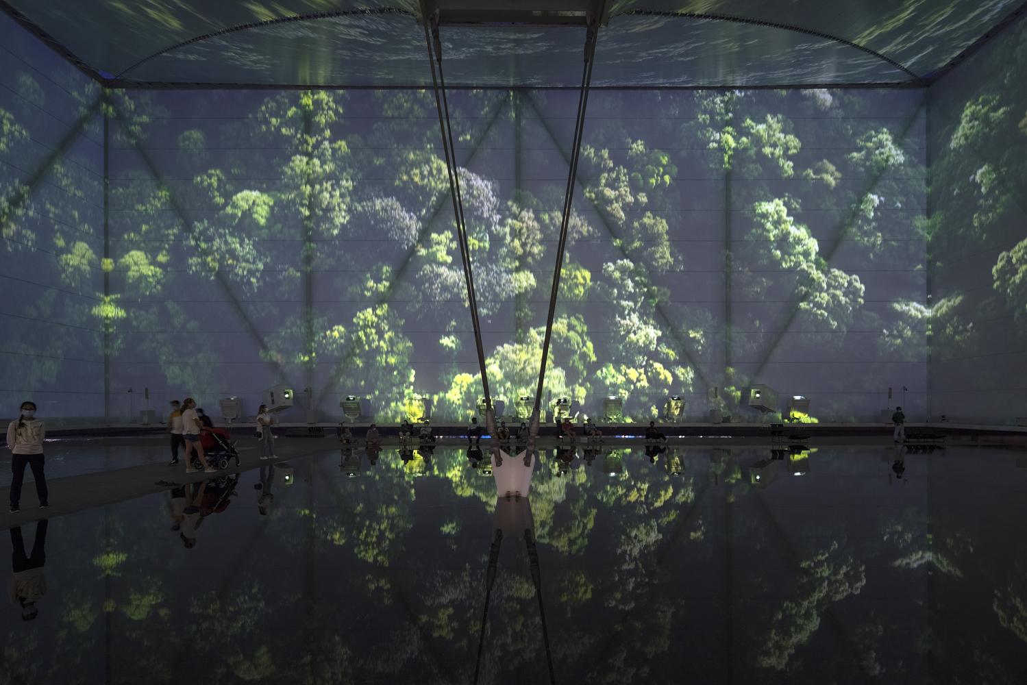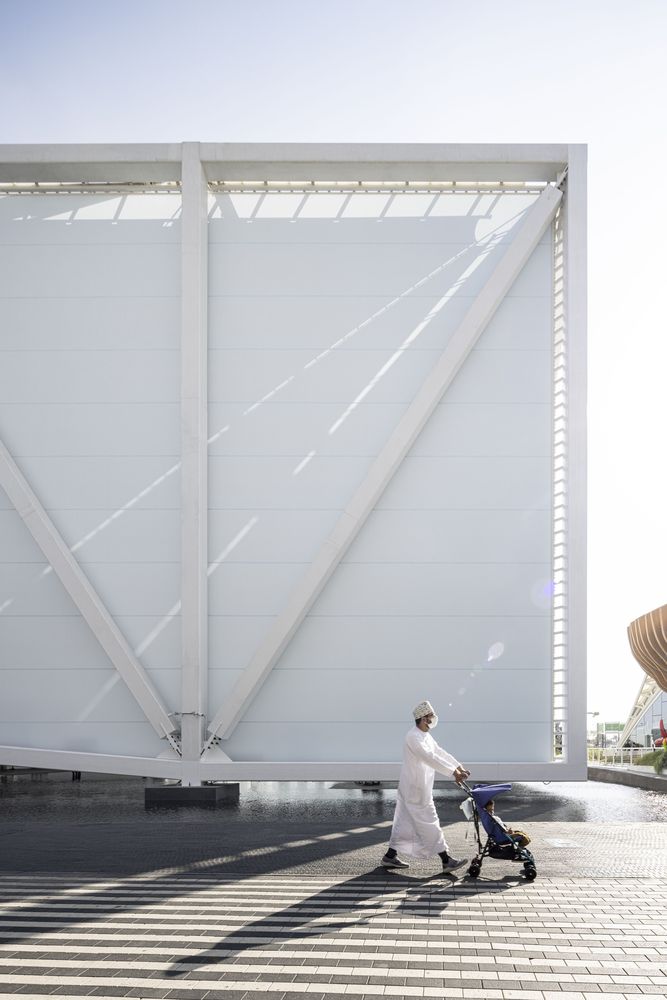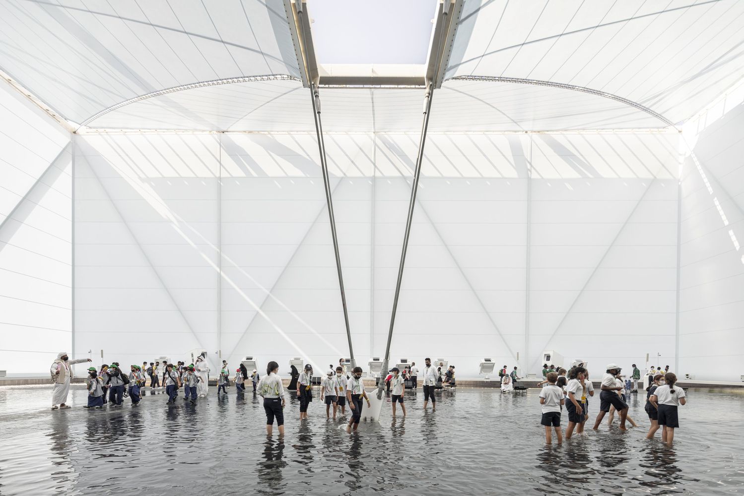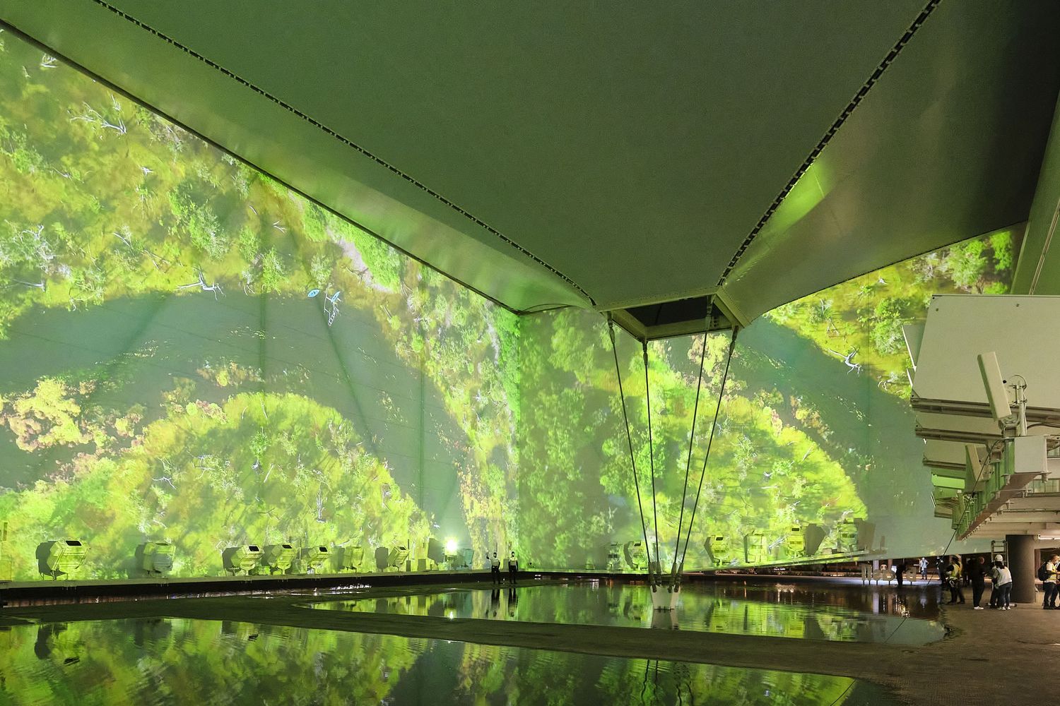 The pavilion features the waters of Brazil - its rivers and mangroves, the birthplace of the fertility of life, a natural inheritance that underlies all discourse about sustainability on the planet. With its tensile steel structure and lightweight white fabric, the pavilion is a fabric onto which videos are projected, creating an immersive atmosphere of variable images, sounds, aromas, and temperatures, over an area of undulating, shallow water through which the pavilion’s visitors may walk. It is a place of interaction, of an arresting scenic character. It is a stage for the visualization of nature and culture focused both on preservation and on a future made sustainable through technology.