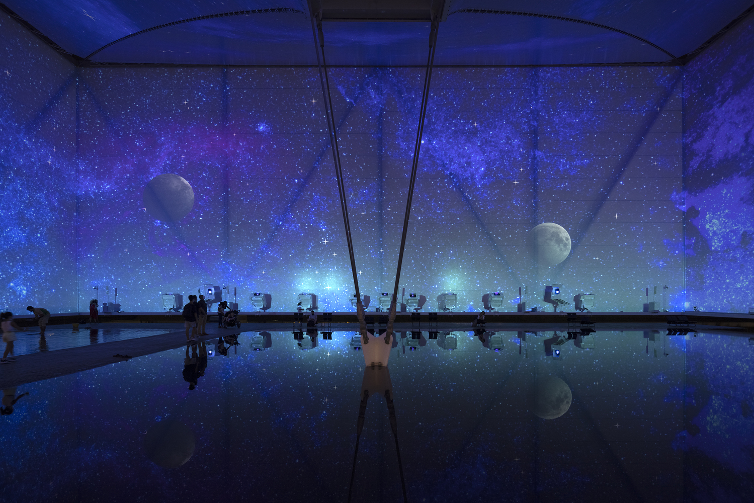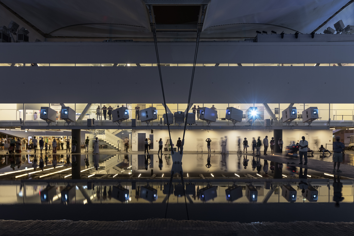 Finally, water is the central element of the proposal, with its associations with our long and profound relationship with our rivers, it becomes, here, a construction material: the support for the exhibition. Eschewing images that diminish the complex diversity of our natural resources or conceal an urgent critical consciousness about the future of the planet, we present the pavilion as a grand water plaza over which hangs a great solar cloud, embracing its visitors and encouraging them to participate actively in a Brazilian environmental experience.