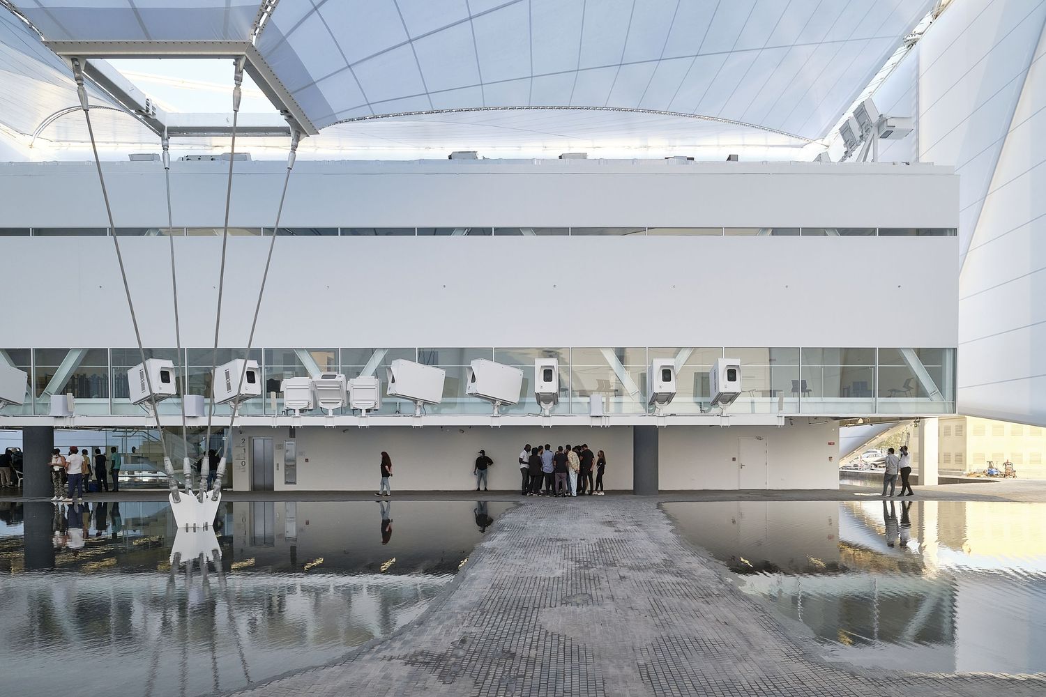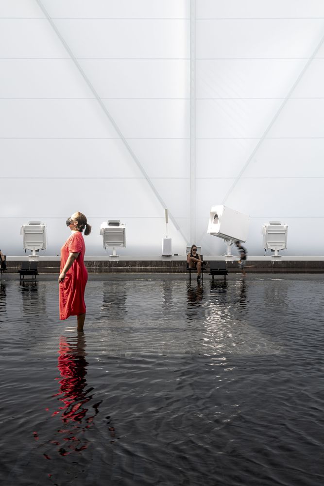 The water plaza is not only a space for visual contemplation but also a place of enjoyment and interaction, of partying. It is the stage for the most important activities of the pavilion, such as acoustic musical performances, dance, and theater presentations that will exploit its daring characteristics. It takes its inspiration from the urban installation "Auditorium for delicate issues" by Guto Lacaz, which will be recreated on the water mirror.
