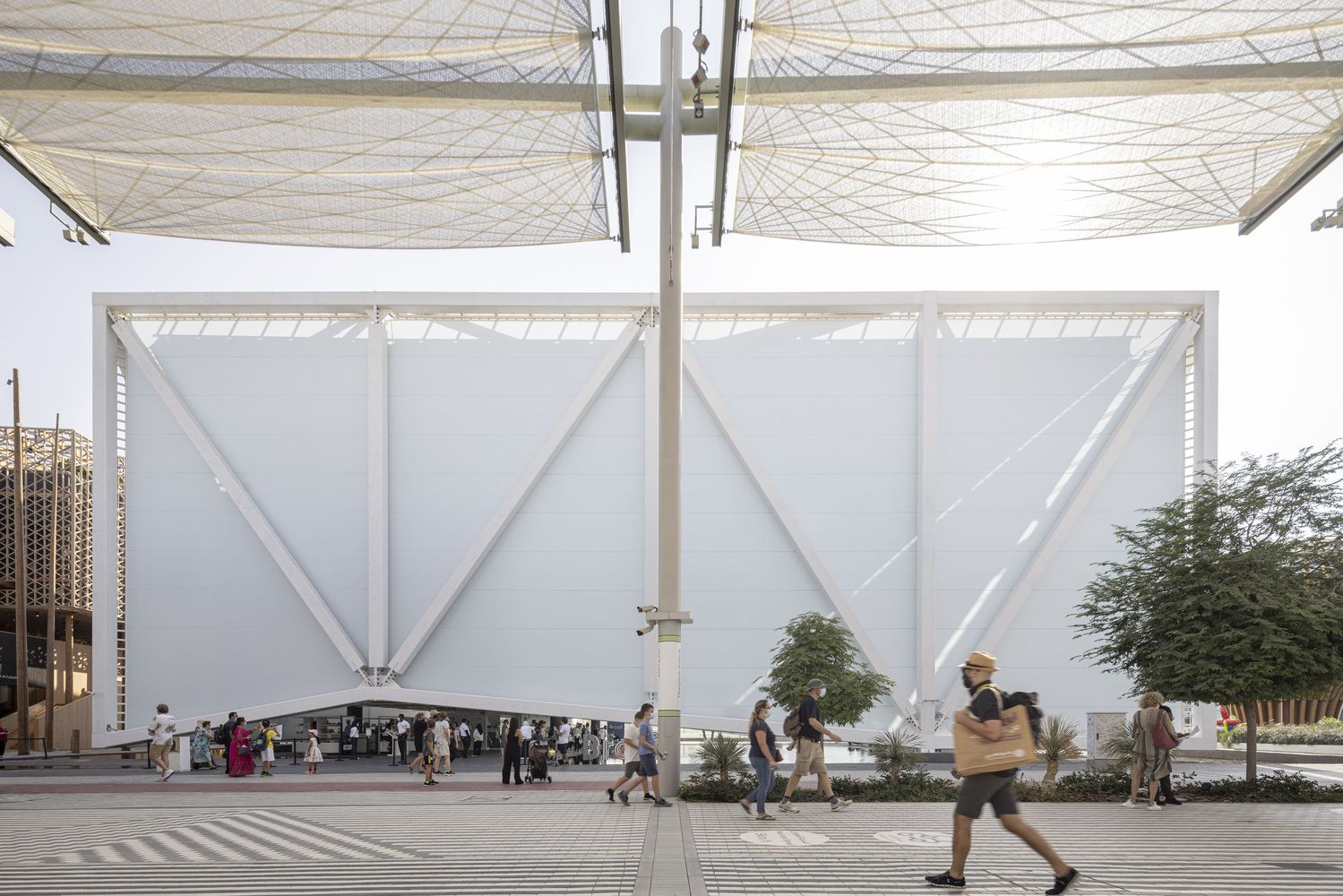 The fabric is a Precontrant fabric by Serge Ferrari, which features a flexible structure of high tenacity PET micro-cables coated with several layers of polymers and finished with a dirt-resistant surface treatment, offering low solar factor translucence and avoiding excessive heat gains. The internal volume has trusses in both of its longitudinal facades, each supported by two pillars, resolving in a rational manner the large proposed cantilevers.