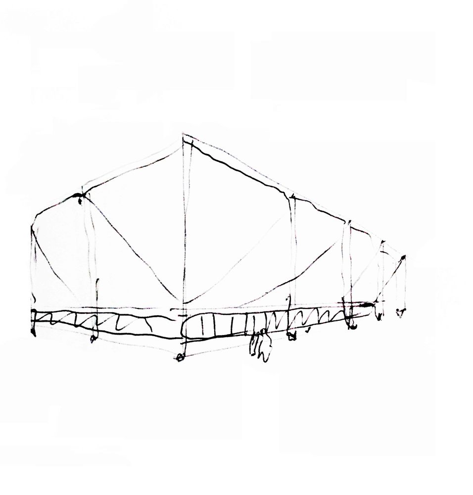 In the horizontal plane along the top of the trusses of the facade is envisioned a compression ring, formed by the beams of the facade and by two more beams inserted in the former, rotated and crossed over each other so as to form struts between the nodes of the facade trusses. This whole set of steel bars is detached from the cover, creating pleasing shadows thrown onto the translucent fabric.