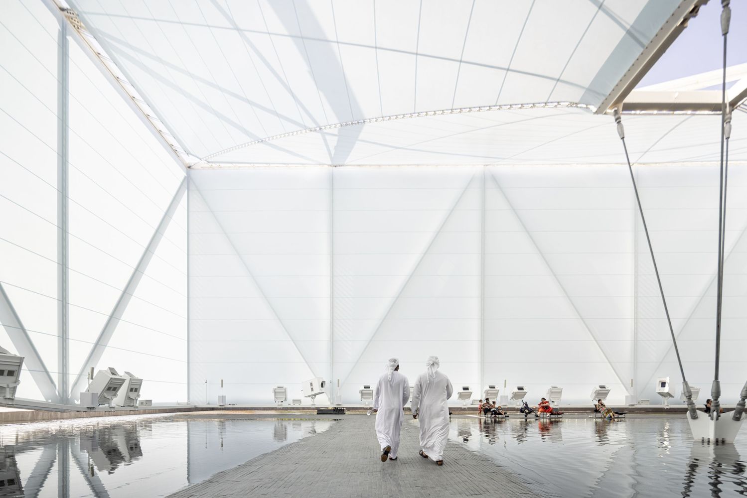 "It is ideas that travel, not materials," says the Paraguayan architect Solano Benítez. We do not seek literally to recreate Brazilian landscapes in Dubai, with real fish or trees. Rather, we hope to reinterpret a Brazilian way of thinking about the relationship between construction and landscape, creating synesthetic and immersive atmospheres, combining the stimuli of sounds, aromas, temperature, and humidity, projected images on the lateral fabric walls and the internal, faceted faces of the roof, and the water surfaces on the floor.\