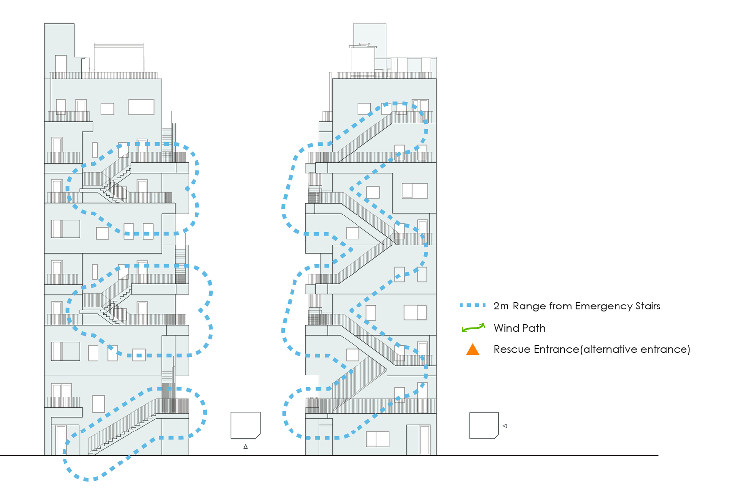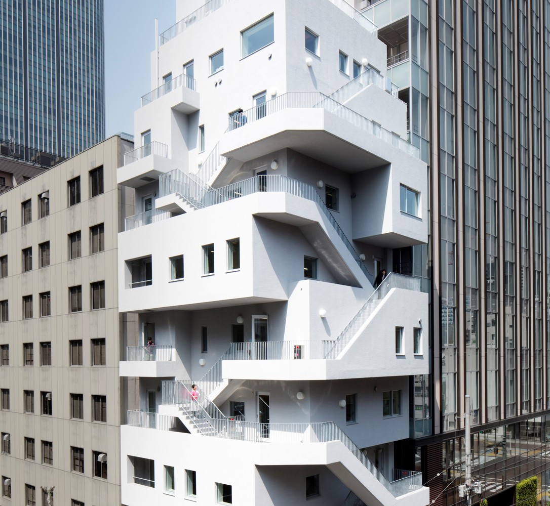 Interface with city and its surroundings - The dynamic building volume created by the emergency stairs and balconies provides a shading effect to the openings of the floors below. As a result, indirect natural light enters through the small openings without the requirement for blinds. In addition, the framed views provided by the small openings evoke a sense of anticipation toward the outside world, like looking at a piece of artwork. At the same time, the different views and a different sense of connection to the city on each floor will create an awareness of being loosely woven into the whole cityscape. In compliance with the Japanese Building Standards Act, only fire-rated fixed windows of maximum 1 sq m in size are applicable within 2m of the emergency stairs. Also, consideration of the rescue entrance (alternative entrance) as well as restrictions on load-bearing walls for structural design was required to secure the maximum number of effectively usable windows.