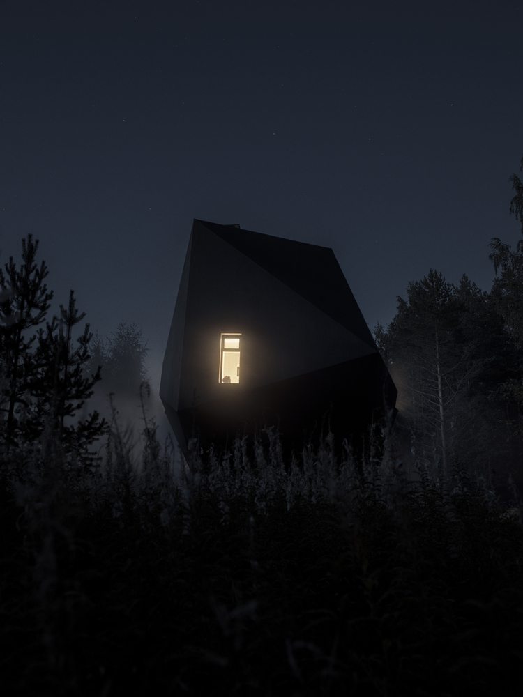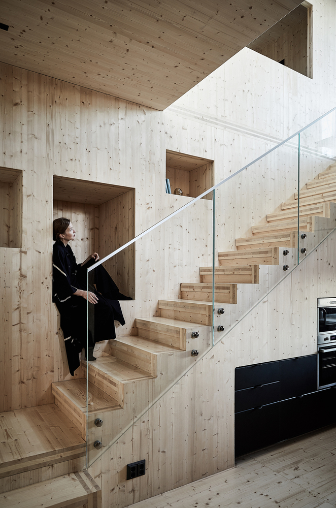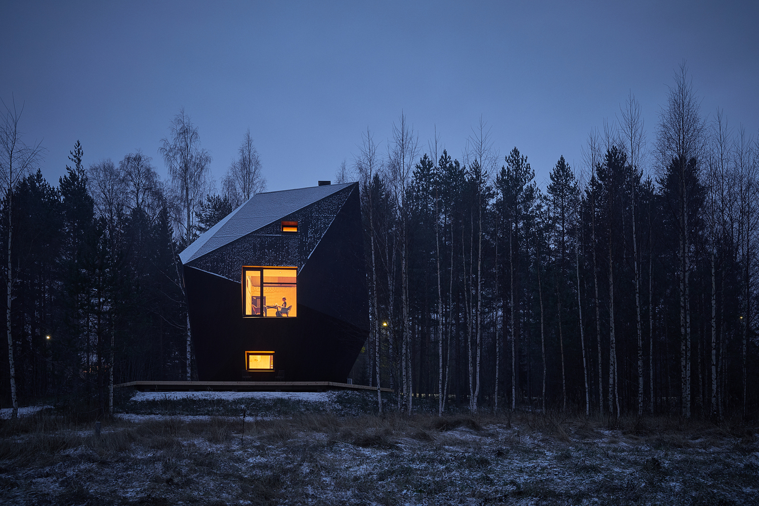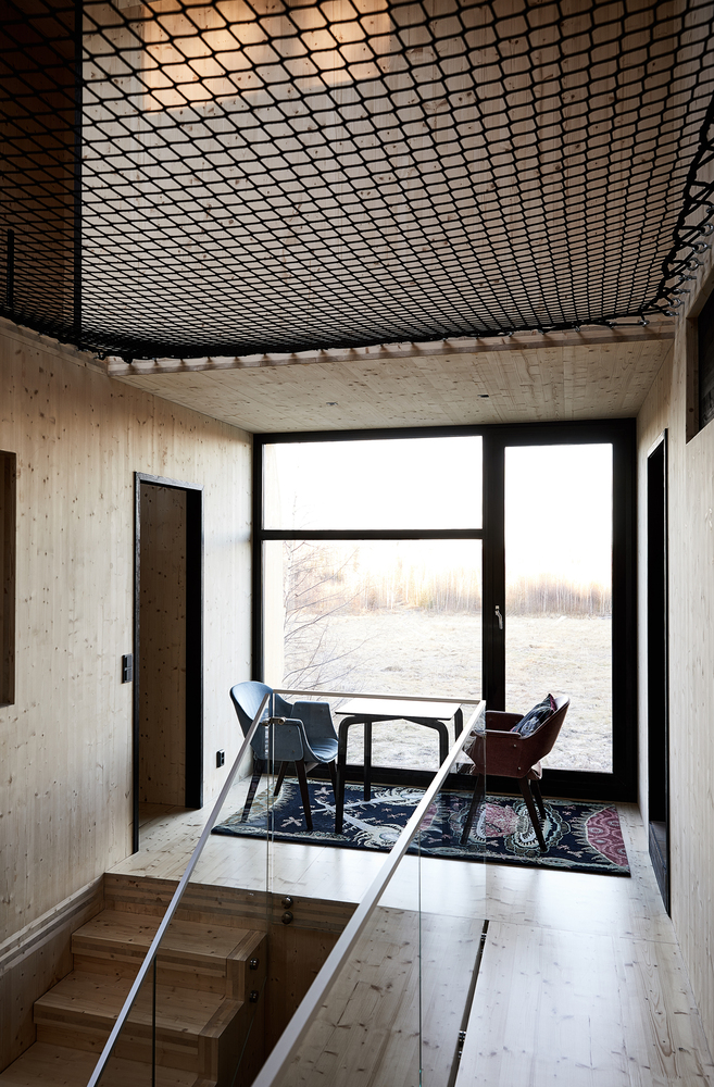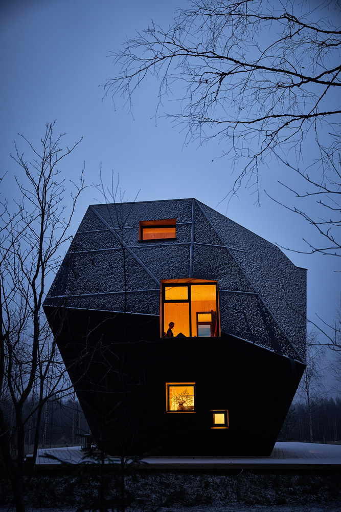 “Meteorite is not a large house, but on the inside, it represents a completely new 3-dimensional open-concept way of organizing living space,” says Ateljé Sotamaa co-founder Kivi Sotamaa. “Unlike traditional houses where each room has a specific predetermined purpose, Meteorite’s architecture supports more dynamic relationships of its residents and a variety of life situations. Digital design and new prefabrication and construction technologies enable the creation of unique, aesthetically high-quality ecological wood buildings that add experiential value to their locations.”