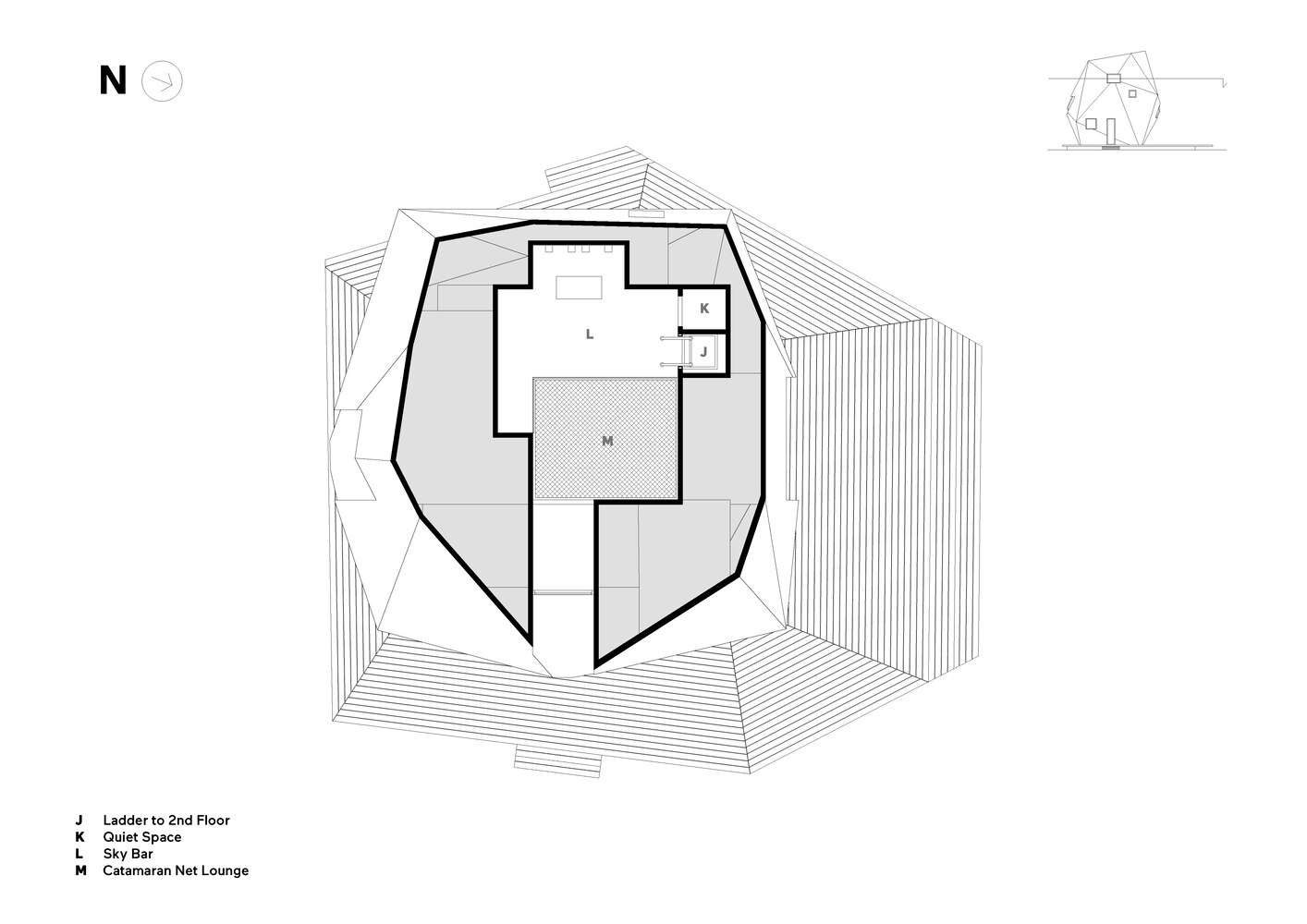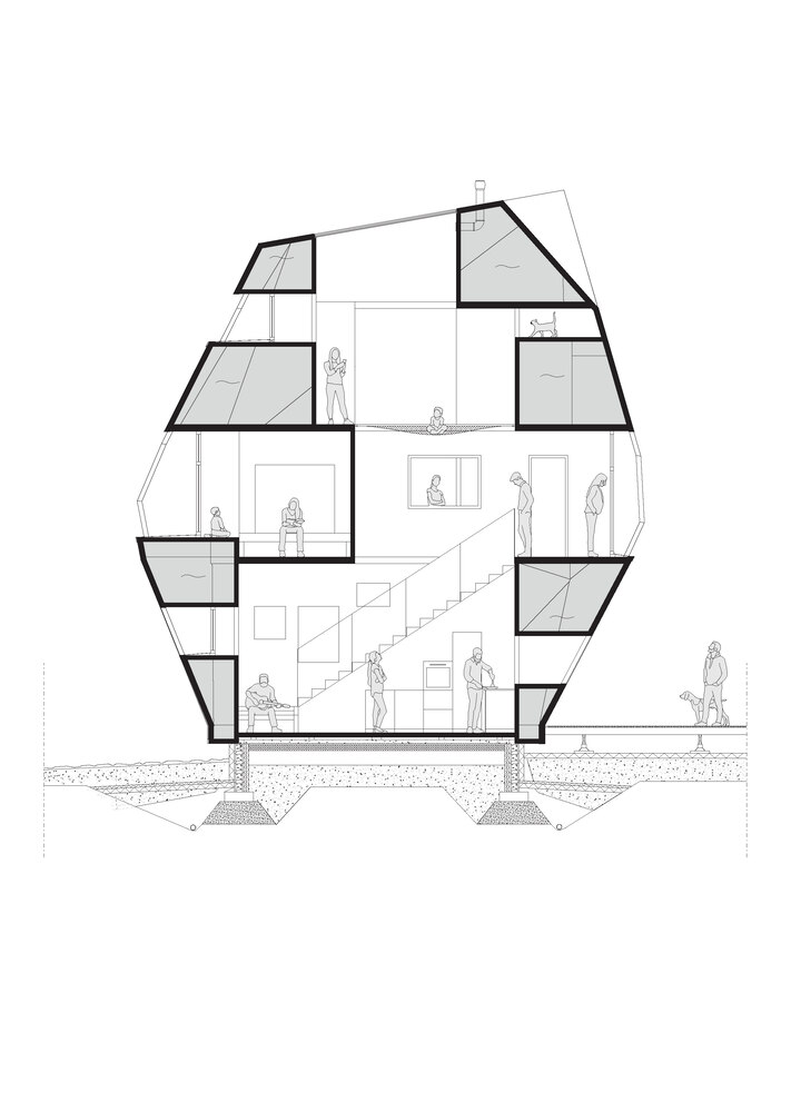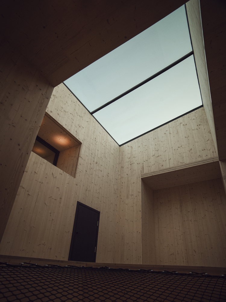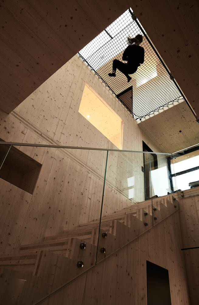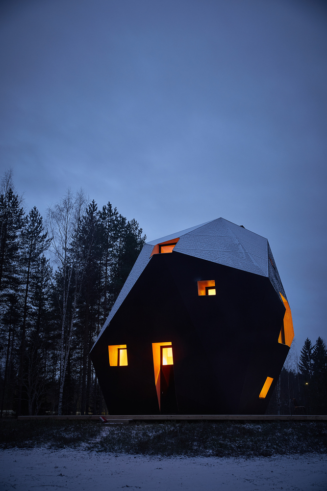 In the middle of the polyhedron-shaped Meteorite, a tall atrium with a large 10 sq. m. skylight provides an unobstructed view of the stars. Another unique feature of the house is a catamaran net at a height of seven meters on which the residents can “float” to stimulate creative thinking. Meteorite is made of prefabricated cross-laminated timber (CLT) panels, it is insulated by air, and uses natural ventilation. The building that has captured close to 60 tons of carbon dioxide into its materials is introduced to the public for the first time in an exhibition at the Olympic Stadium of Helsinki during Helsinki Design Week.