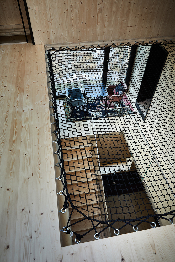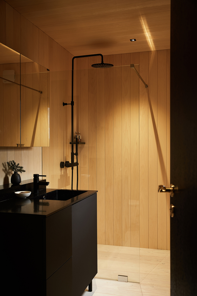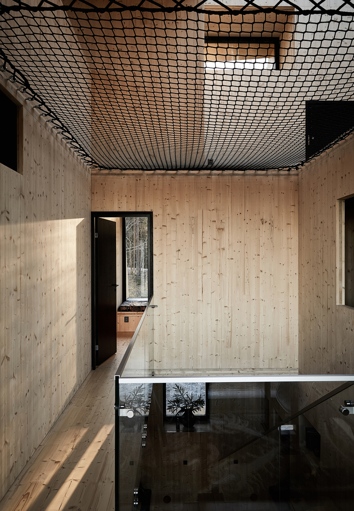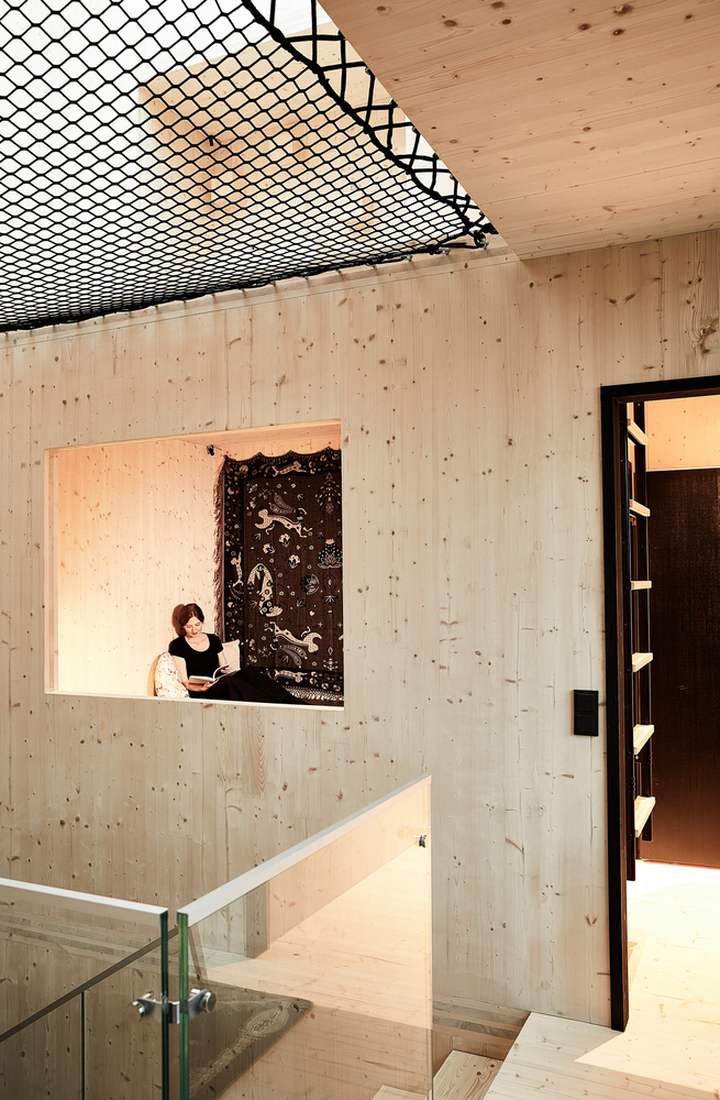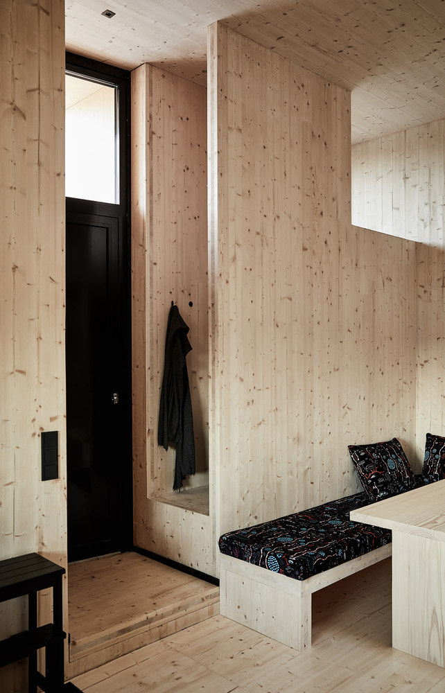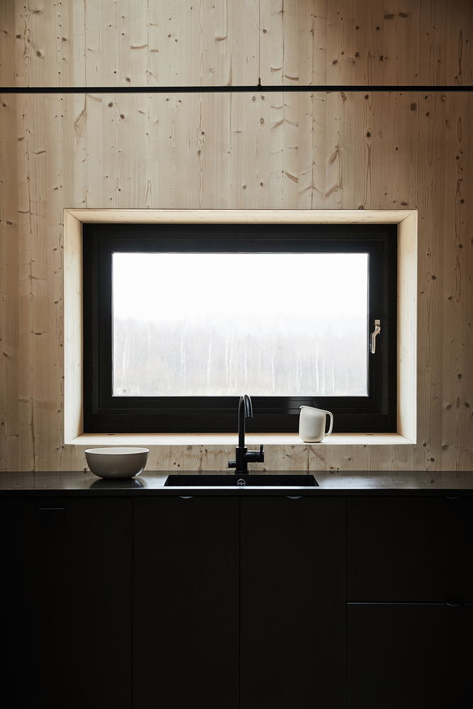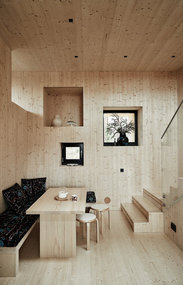 "Every building materializes our relationship with the natural environment,” Koivula says. ”My inspiration to have a unique wood house built in this country sprouted from the rocky hills and rugged woods of Koli, rich in erratic boulders that also served Finland’s defense during the Winter War. Meteorite reflects the connection my soul has to Finnish nature, and looking through one of its large windows to the misty fields around takes me back to the calm days of childhood. We use the house as a creative space for remote work, hobbies, and hanging out together. In the old days, families gathered into a large horizontal kitchen space to be together; we now interconnect vertically with each other and with the surrounding nature. In this time and age with effective telecommunications and speed trains to the metropolitan region, this is a paradise for us to get settled into the good life.”