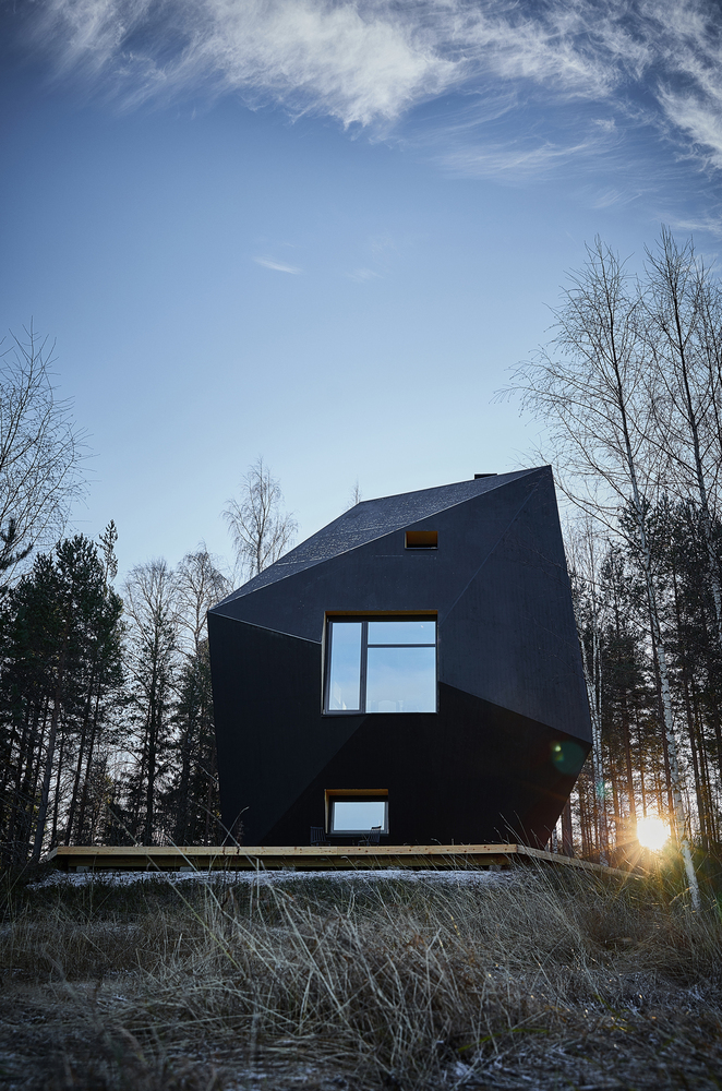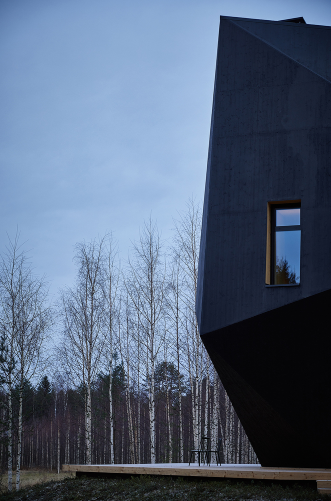 ‘Meteorite’ designed by Ateljé Sotamaa is a residential building located in seemingly remote Kontiolahti in eastern Finland. Approached on foot through the woods – as preferred by the architect – it appears a mystical dark object among the trees. The inside of this ultra-modern, ecological, three-storey wood building, however, is another world of open interconnected rooms that integrate with the surrounding landscape.