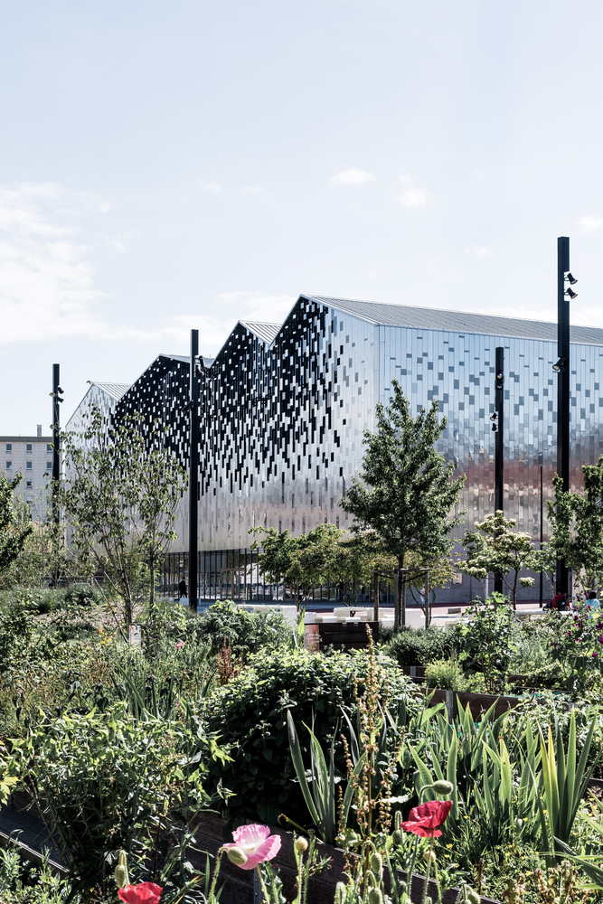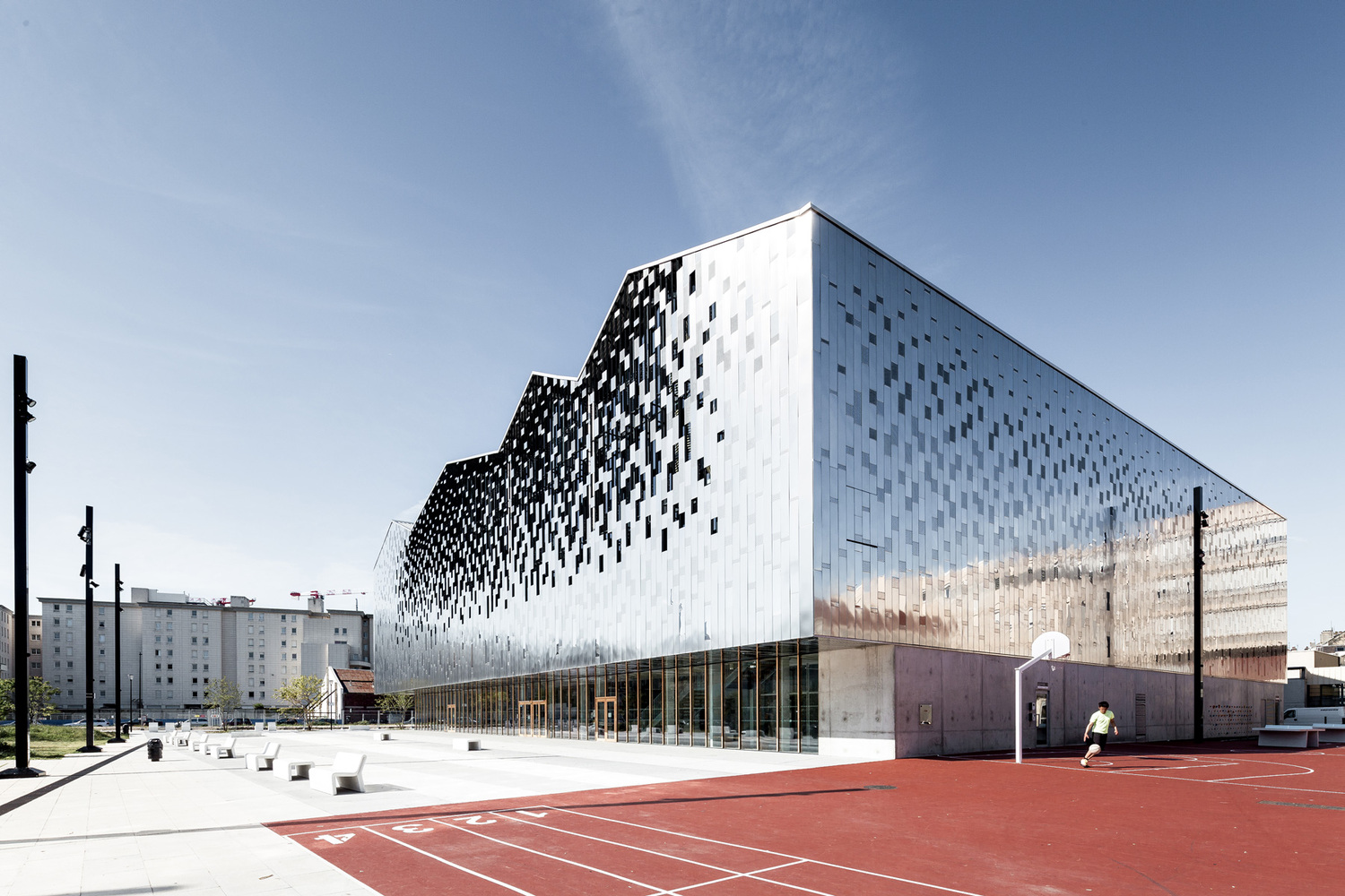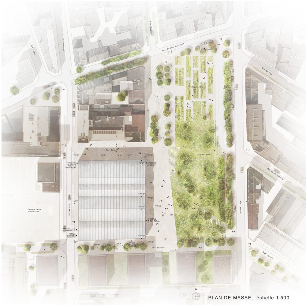 The project is part of a simple plan that completes the framework of a new public square intended to unite the neighborhood. Its facades are kindly aligned with those of the neighboring streets to underline the shape of this vast collective space which combines an ample mineral mall with intimate gardens. The building draws its genesis from the archetypal morphology of the brick warehouses that populated the neighboring docks. This urban landscape, crenelated with double-pitched roofs, is undeniably linked to the heritage of Le Havre to the point of making it a familiar vector of well-being. The project reproduces their profile to perpetuate their almost melancholy symbol, that of a flourishing and peaceful era. It also pays homage to the simple beauty of their capable large volumes by attributing their efficiency to sports spaces.