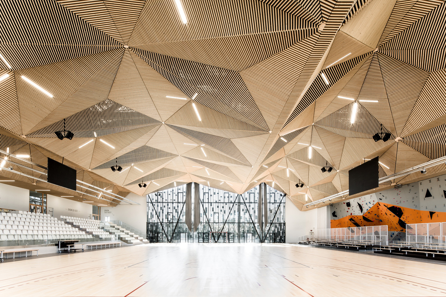 The interior architecture echoes the exterior envelope in a more domestic register. It takes up the theme of clarity by diffusing a generous light through fluid spaces that seem powdered with a vaporous white. Wood structures this peaceful general atmosphere and de facto adds a feeling of well-being, stemming from its biophilic action. It is the large sports hall that benefits the most, with an entirely wooded suspended vault following a sophisticated geometry.