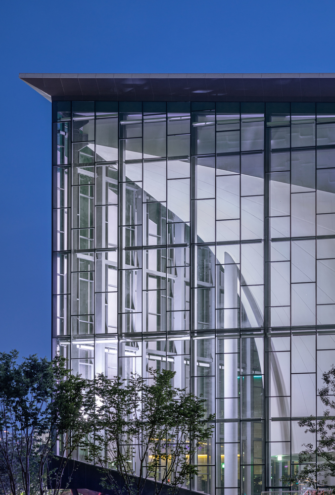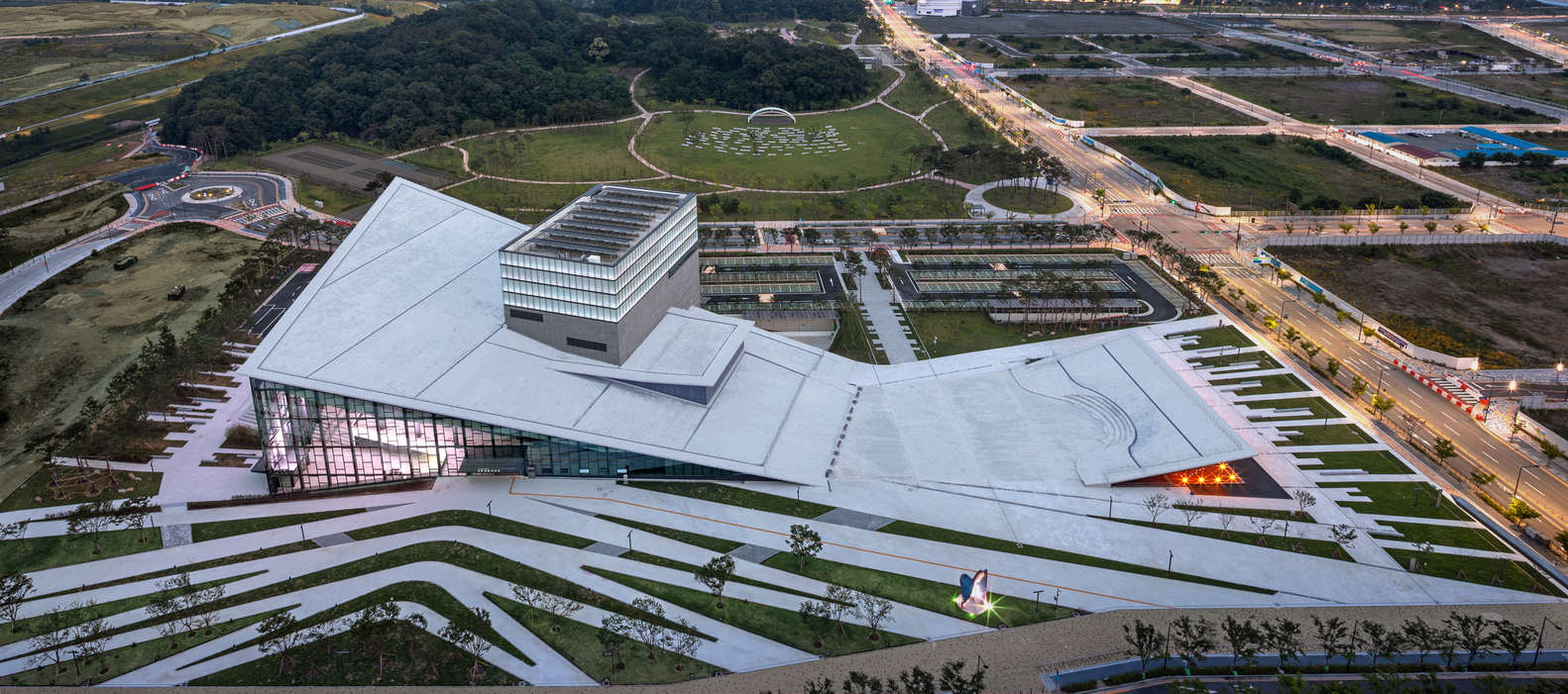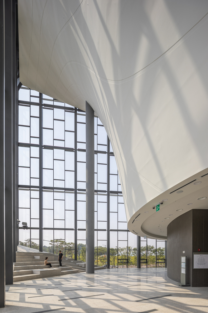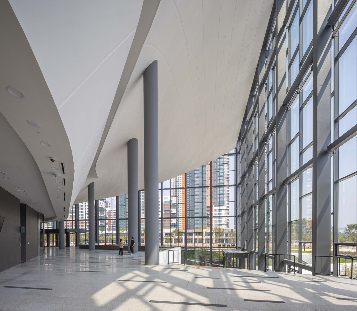 Forming a continuum with the ground, the center of the site serves as the void area, the place from which a grand reverse arch-like form extends like a bowl to embrace the surrounding landscape under the sky, and along this direction, the terrestrial movement is represented like the flow of waves or water rippling to guide pedestrians approaching the entrance of the building.
