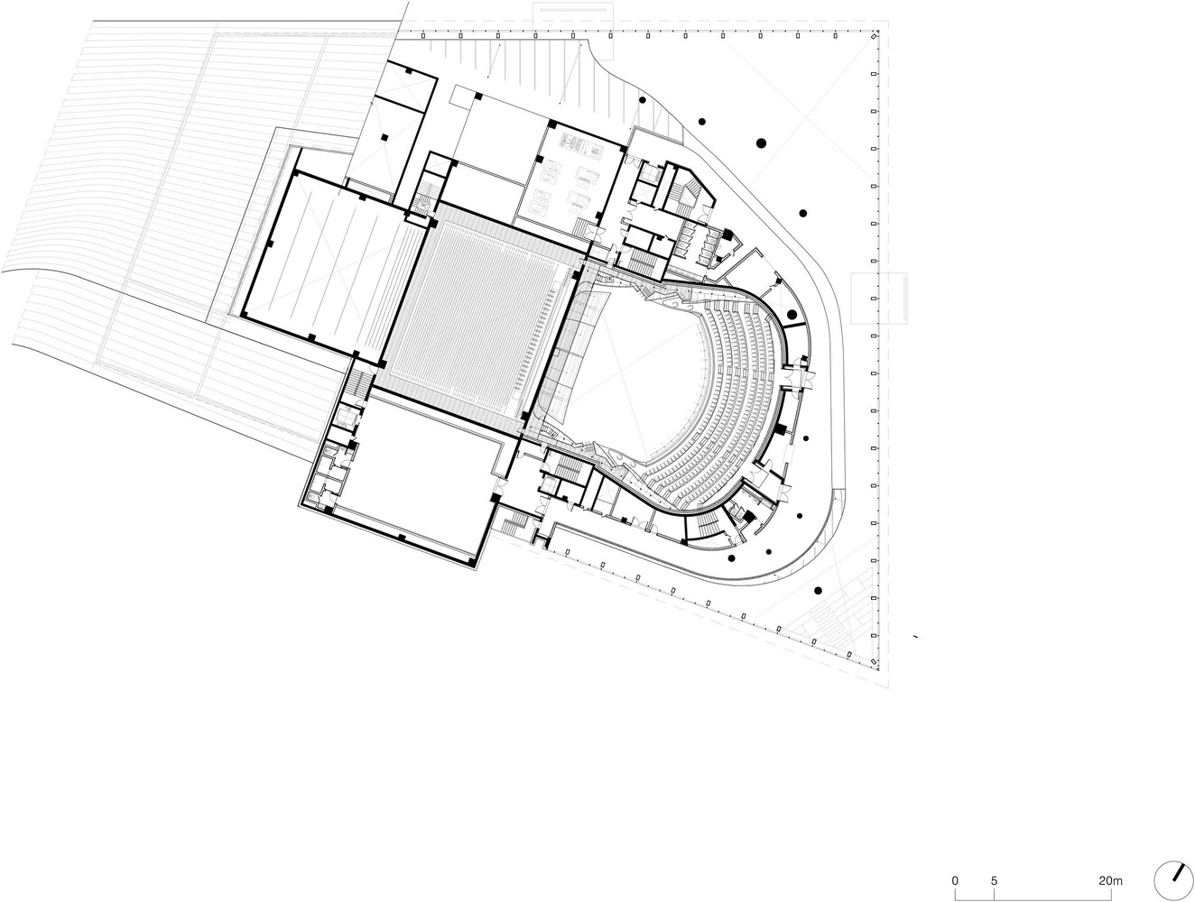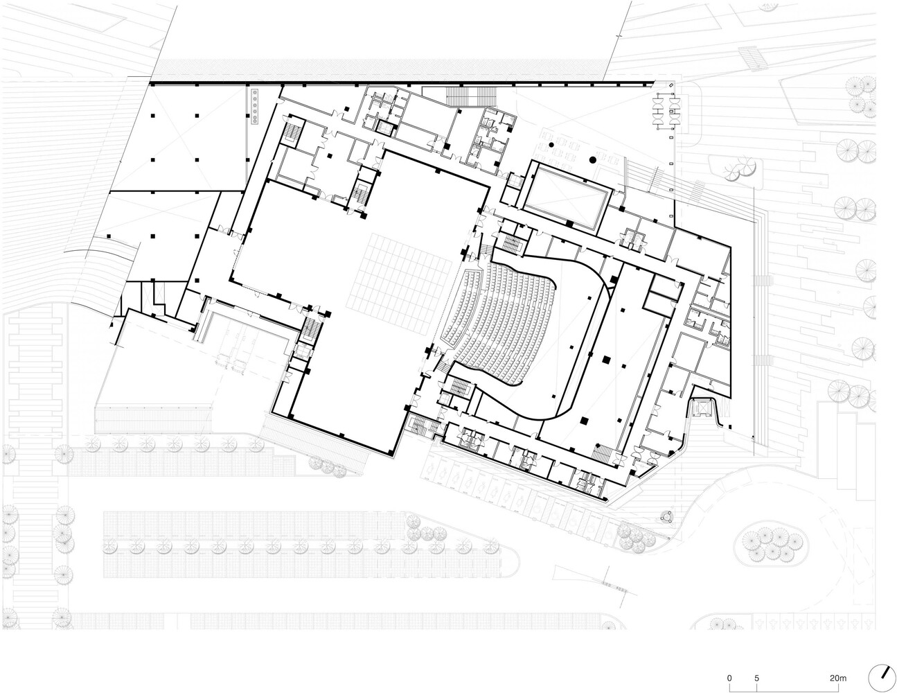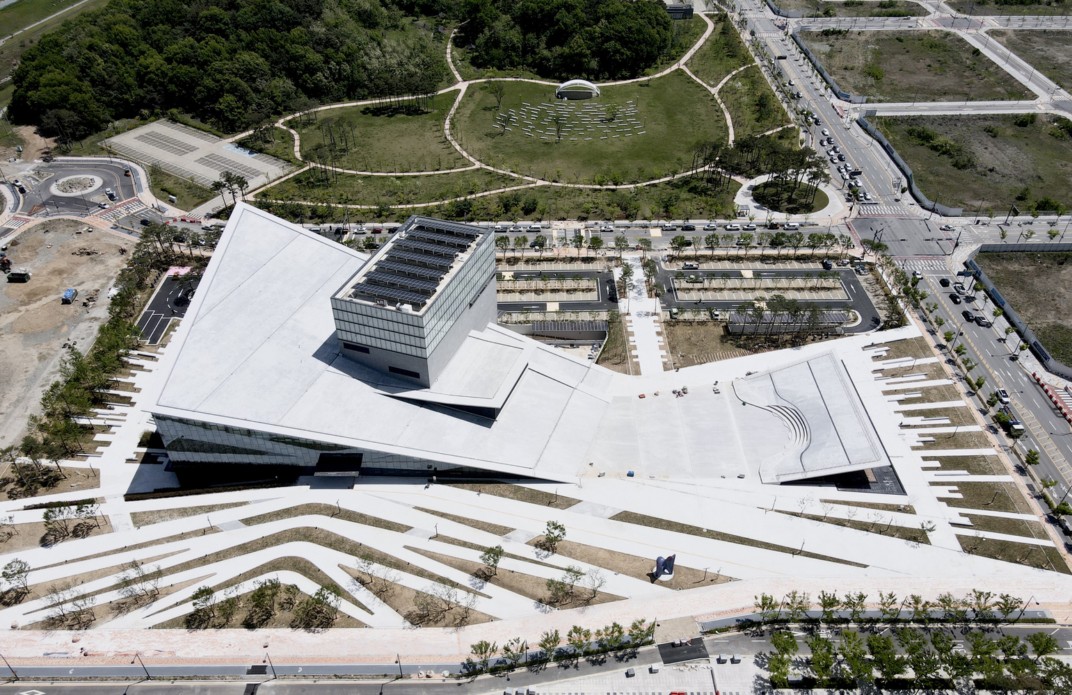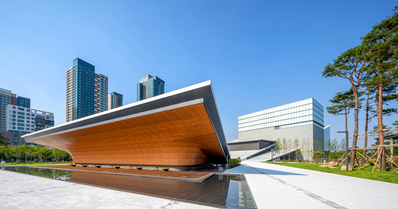 Forming a continuum with the ground, the center of the site serves as the void area, the place from which a grand reverse arch-like form extends like a bowl to embrace the surrounding landscape under the sky, and along this direction, the terrestrial movement is represented like the flow of waves or water rippling to guide pedestrians approaching the entrance of the building.