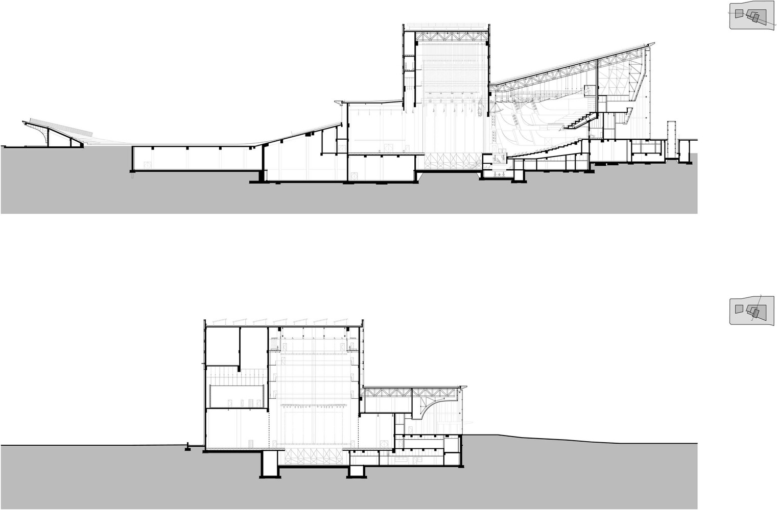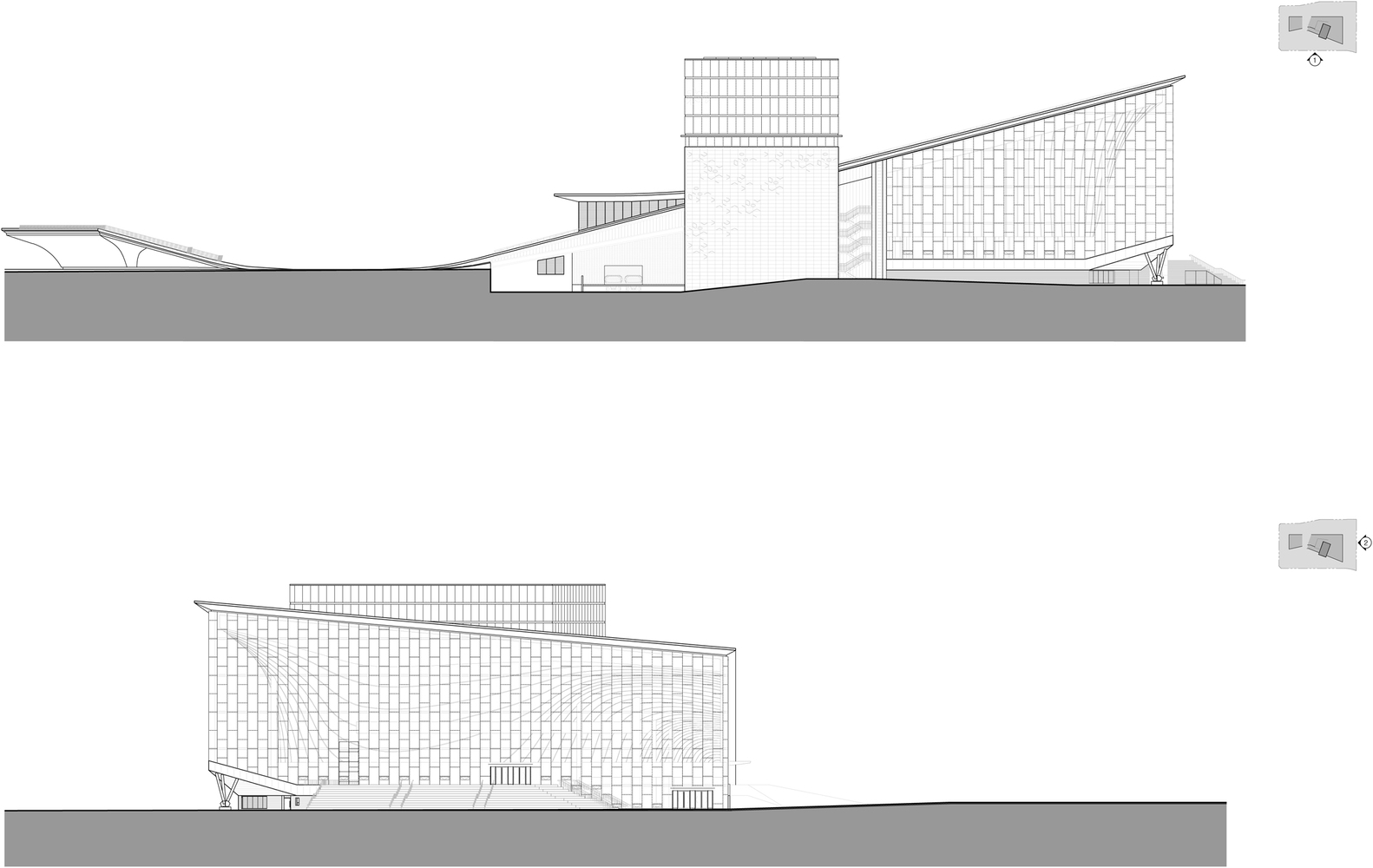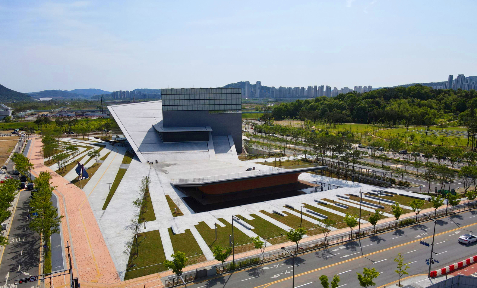 The most basic idea for creating the building figure of Sejong Art Center is to cut some surface off the land and elevate both ends from the ground level. Clipping both ends of the site and lifting them in opposite directions, we intended to open the two front facades toward the city and the park. This made both fronts provide at once two different orientations of views around the city.