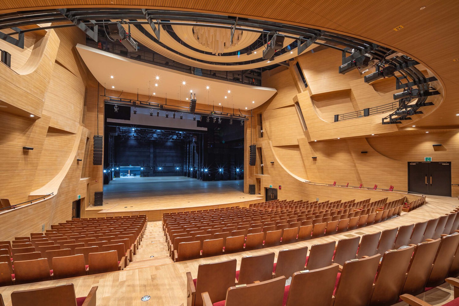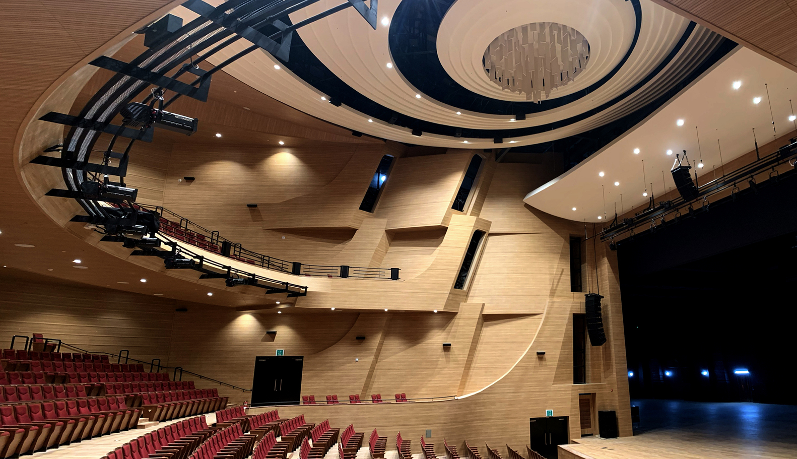 At the end of this course, visitors come to stand before the performance hall which is a centripetal point of convergence in the whole area. We hoped the hall itself would be an original point that provides experiences in which one can feel all senses anew. The sound and light rippling and spreading from the epicenter wrap around the stage as if a number of trumpets transmit an echoing sound. All the senses created by such sound and lighting effects will be brought again to performers again.