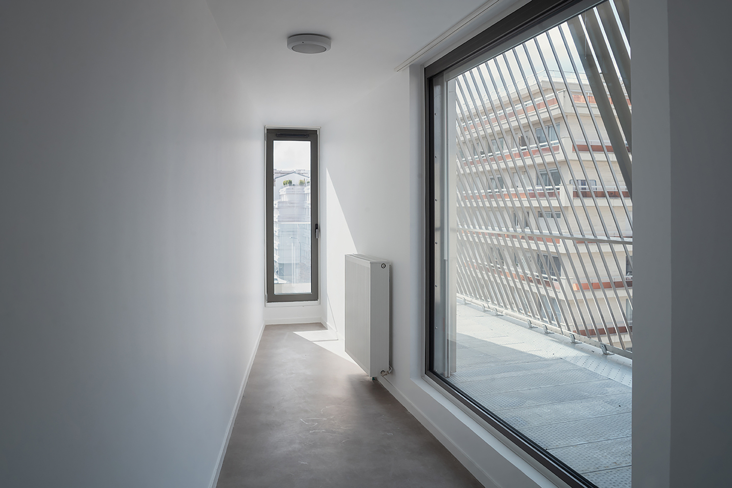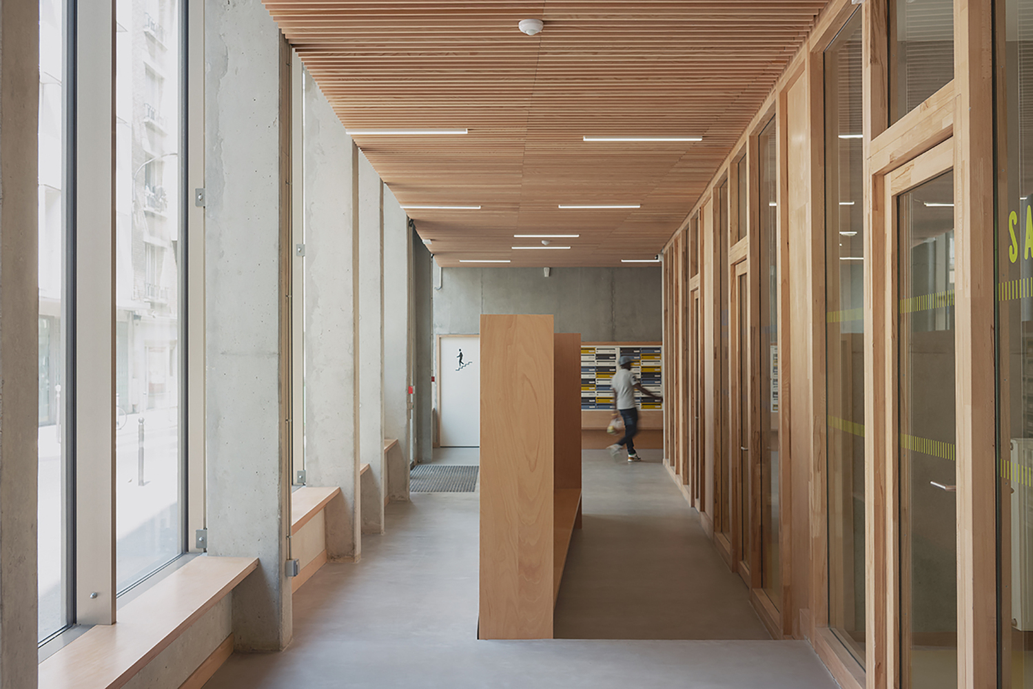 The choice to assert the linearity of the project has resulted in an optimized, repetitive layout and a flexible floor plan that allows for future mutability. All apartments benefit from natural light. The residences for students and young workers are organized around a naturally lit central corridor, while the migrant workers’ apartments, where the plot is the narrowest, are articulated by a partially glazed corridor offering (secondary) views of the train tracks. The first level accommodates the sports and multipurpose rooms. They open up to the city, thus forging a connection with the urban character of Rue Castagnary.