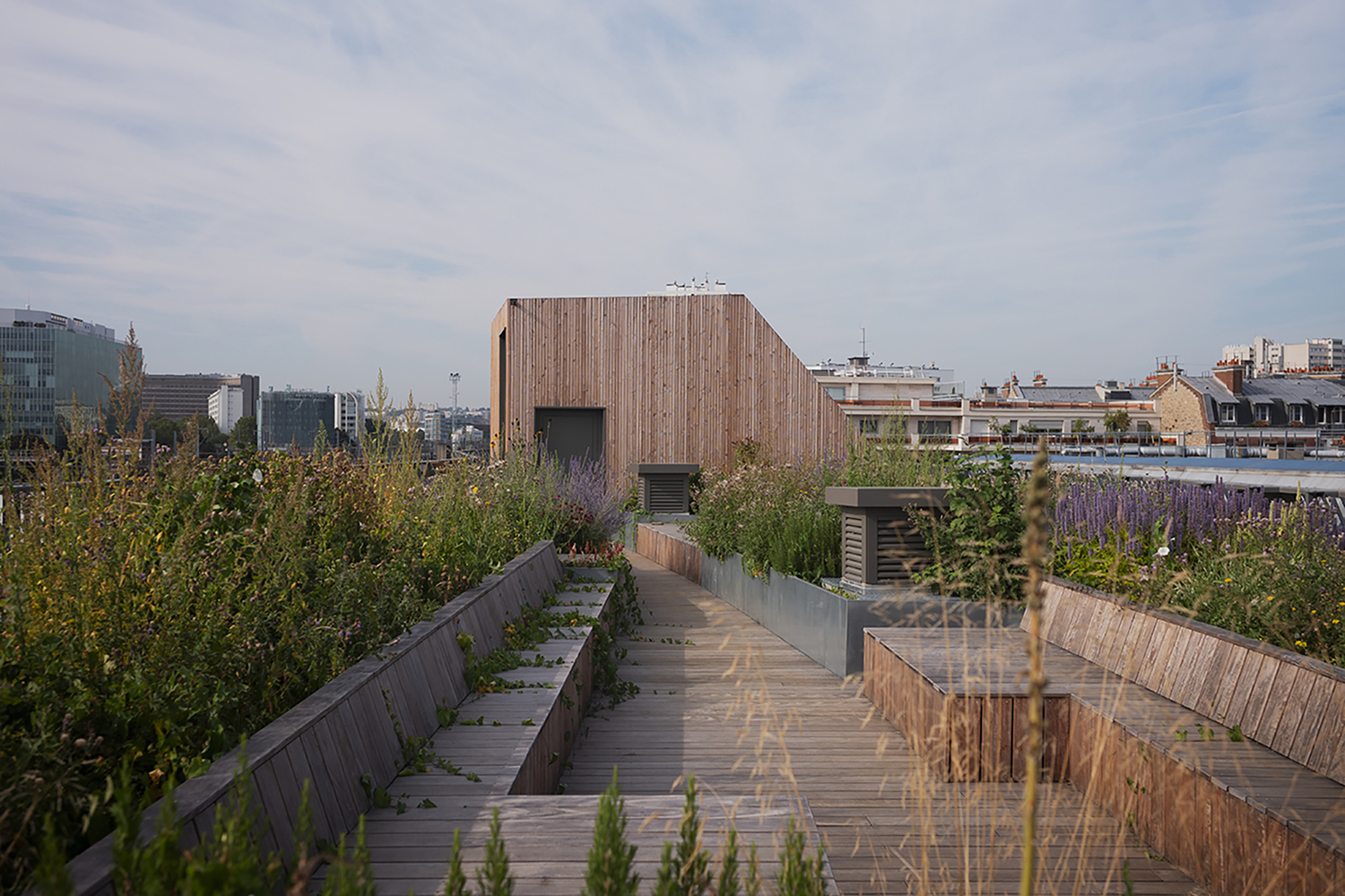 Intermediate cross walls with an optimized seven-meter long span free up the floor plan for future mutability: the building will thus be able to evolve and accommodate new uses, thus contributing to the mutability of the concept. Echoing this slender plot and the narrowness of Rue Castagnary, the linear building forms a subtle shift between the adjoining vegetated slope, the project’s mineral forecourt, and the garden to the rear along the railroad tracks.