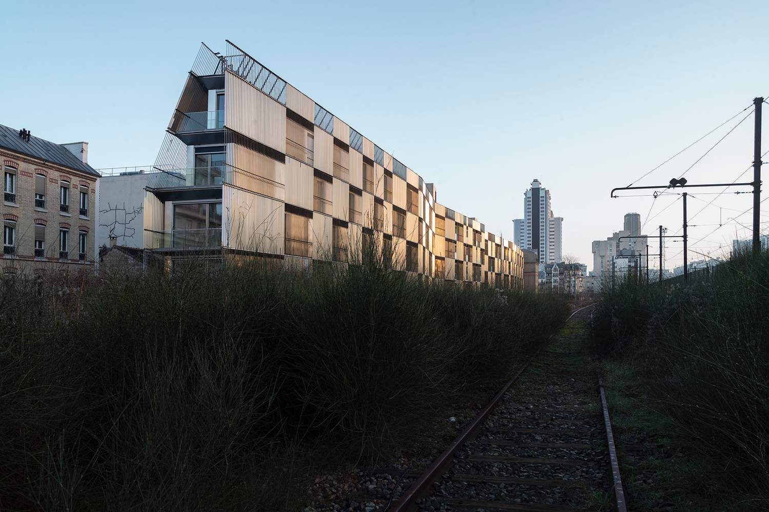 This architectural gesture evokes the fuselage of a train, it delicately marks the angle of the site and affirms the uniqueness of the building and the narrowness of the plot, thereby enhancing its relationship to the site. The finesse and lightness of the façade, as well as its materiality, contribute to the simple yet dense program on the site. The architecture responds subtly to its urban context, the city lights, the different seasons and their colors, and the interior life of the residence. The alternating filter device forges a permanent variation of our visual sensation of the façade: its reflections and its abstract patterns dematerialize our perception of the project.