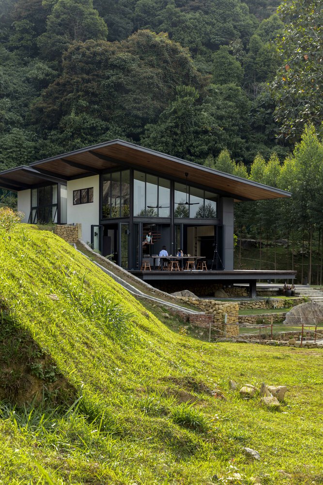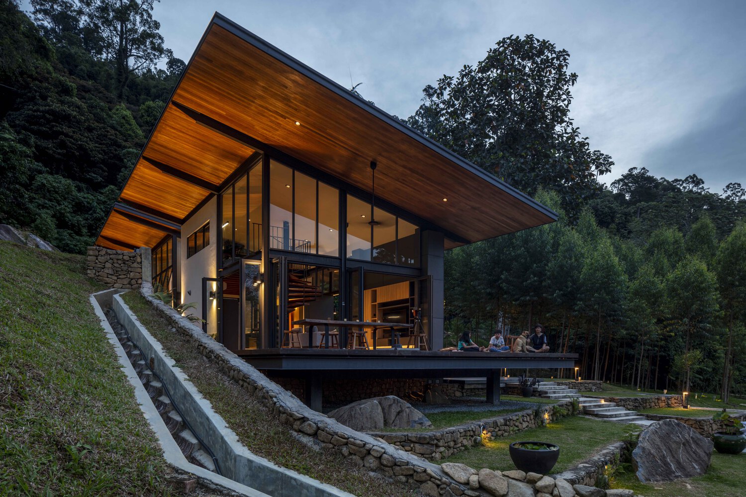 The one-and-a-half storey, 1600-sq-ft abode adopts the stance of a hillside cabin albeit without the steep inclines and overt vernacular overtones. Its modernist rectilinear form is stilted like a traditional Malay kampung house, and immense two-tier platform thrusts over lawned terraces in frozen inertia. A corresponding pitched roof, with its 3.5-metre cantilever, enhances that captured movement to create the cabin’s dynamic silhouette.