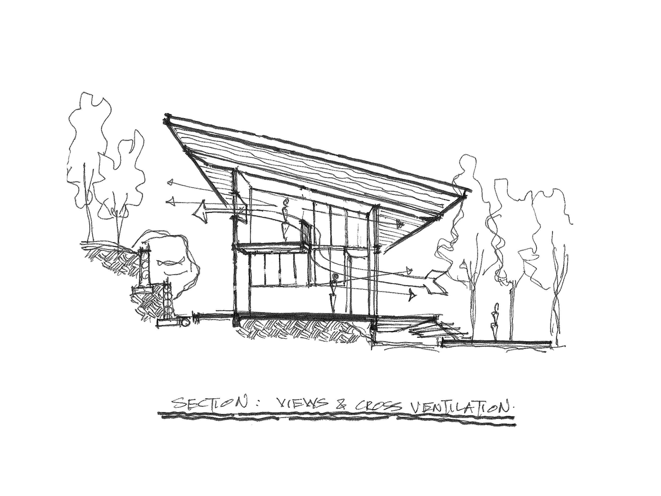 Beyond its corporeal elements, the cabin must serve living needs inarguably less tangible. A bright indoors, for example, is essential to liveability; the full-height doors and windows invite daylight into the northeast-southwest oriented plan, the double-volume interior of living, dining, kitchen and loft illuminated throughout the day. Another benefit conferred by these large openings is natural ventilation, which equates to fan-cooled comfort without the need for air-conditioning. Beneath its large overhang, the main deck is as comfortable space for sun-lounging as it's for overnight camping.