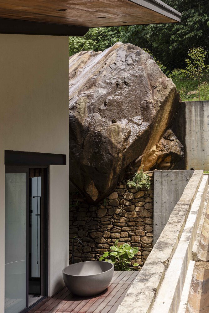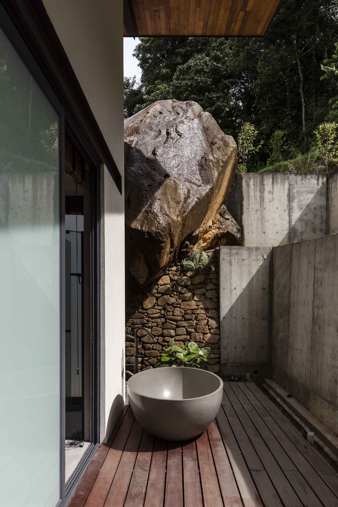 While expressing its lightness, Smolhaven nevertheless retains a strong connection to the ground plane and site. The polished concrete floor of terrazzo-like quality embodies this groundedness, as does the Equitone cladding of the front elevation. Finished to a thick wall depth, the stone-grey fiber cement panels visibly anchor the building with their pronounced heft. A high rubble wall achieves a similar effect at the cabin’s rear, its strength accentuated by a massive boulder discovered on-site that singularly lends gravitas and spectacle to an open-air bathroom experience. The lawned terraces are likewise framed by rock and rubble, their contouring of grass and earth enhancing the cabin’s hillside-retreat appearance.