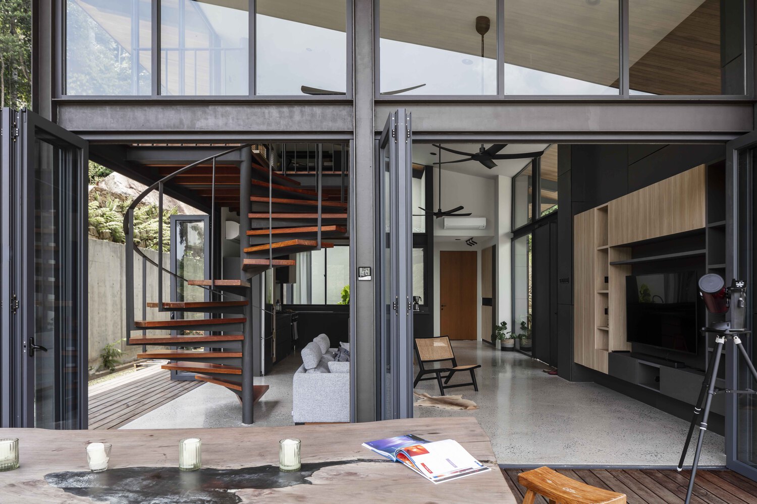 Exposed brick, off-form concrete and timber are de rigueur materials in the context of Malaysian tropical modernism, and timber is certainly celebrated here. Planks of seasoned merbau line the cabin’s loft, decks, spiral staircase and perimeter walkways, while golden brown nyatoh strips form an elegant soffit above. Together with dark grey steel structures, the timbers, enclosing glass façades and building geometries contrive towards a lightweight tropical aesthetic.