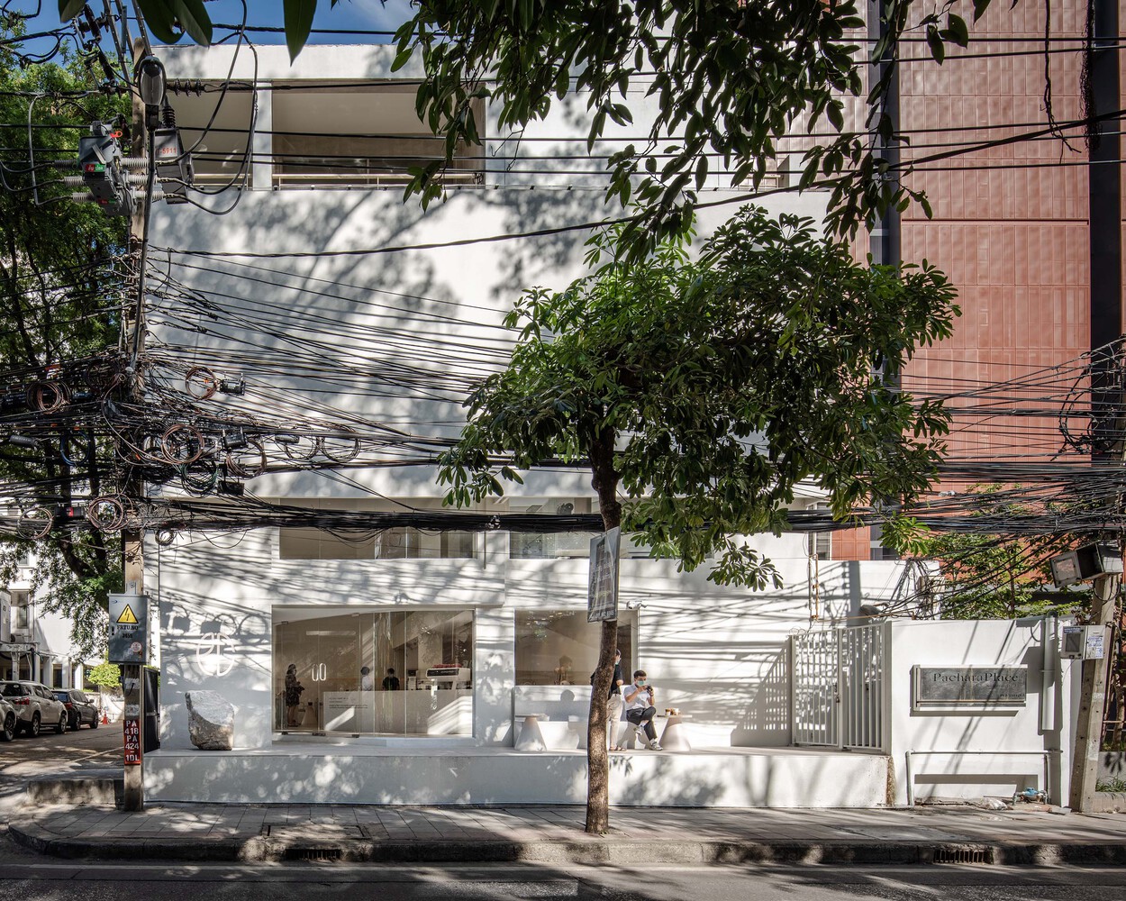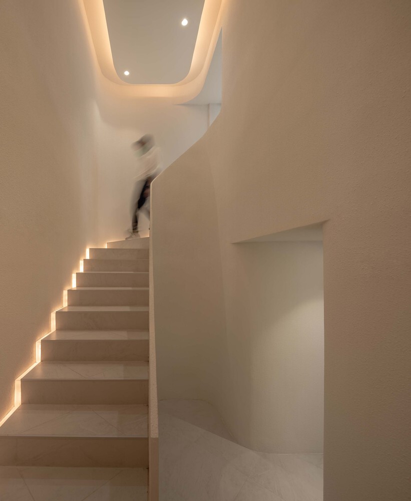 PAGA MICROROASTERY is inspired by ‘The Mountain’ where coffee beans are cultivated, in order to pay tribute and advocate the long and fascinating process of micro specialty coffee. The three-storey corner building in the heart of central business district is entirely constructed in white with simple solid dimensional facades, allowing the building to transform and create its natural scenes through the change of the surrounding and sunlight which radiates calmness to the busy neighborhood. This enhances emotional interaction that draw passer-by to come and hike through this micro coffee experience from tasting to making. To deliver a tranquil yet serene corner building, the designer extended little wall to the center pillar, installed an LED engraved shop sign and a big mountain stone at the front to symbolize the story of PAGA.
