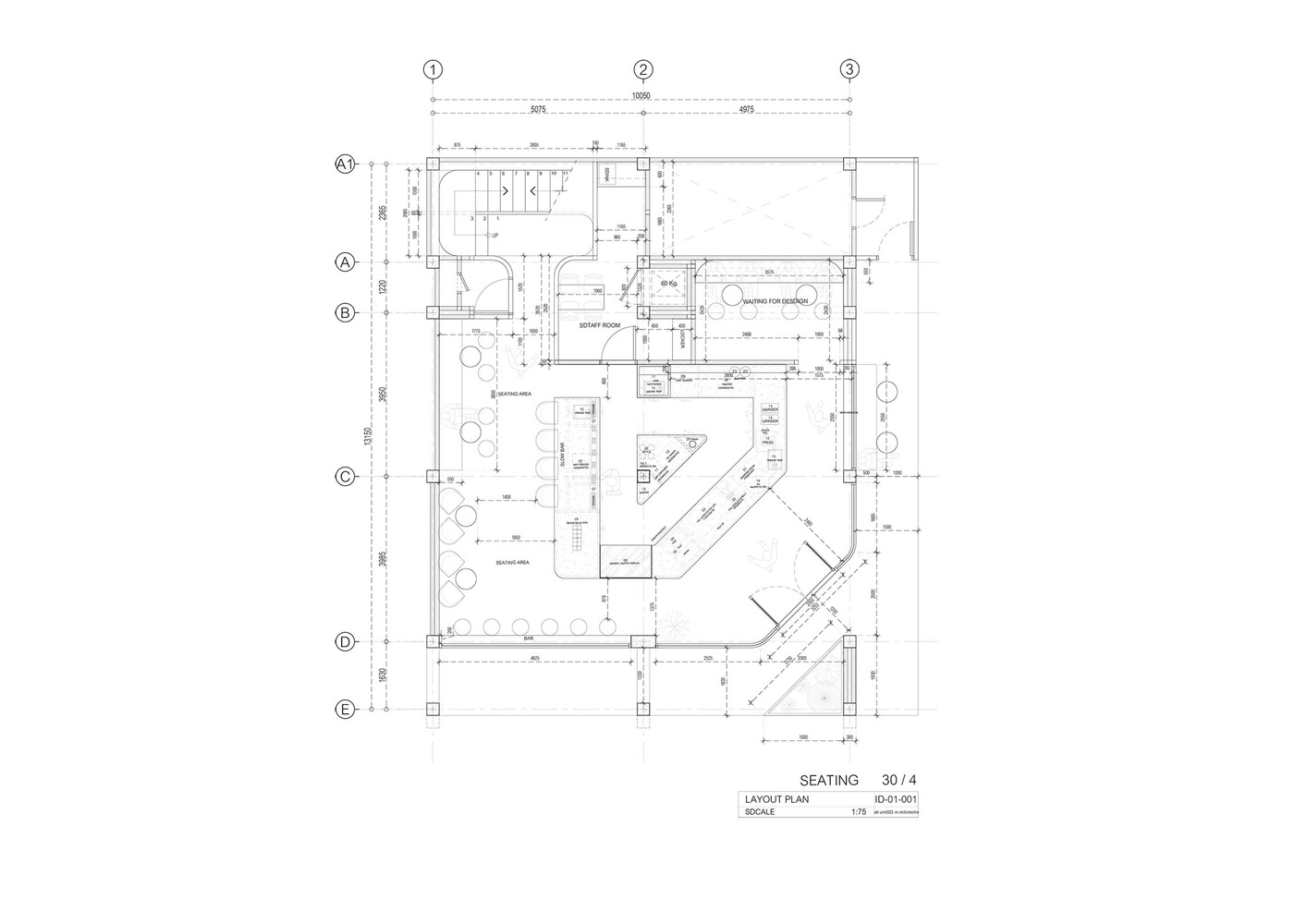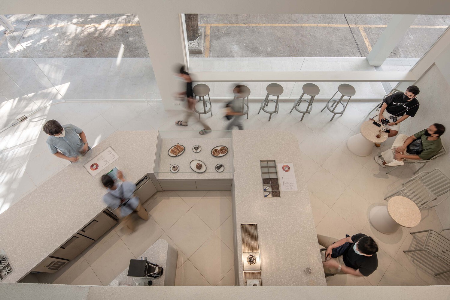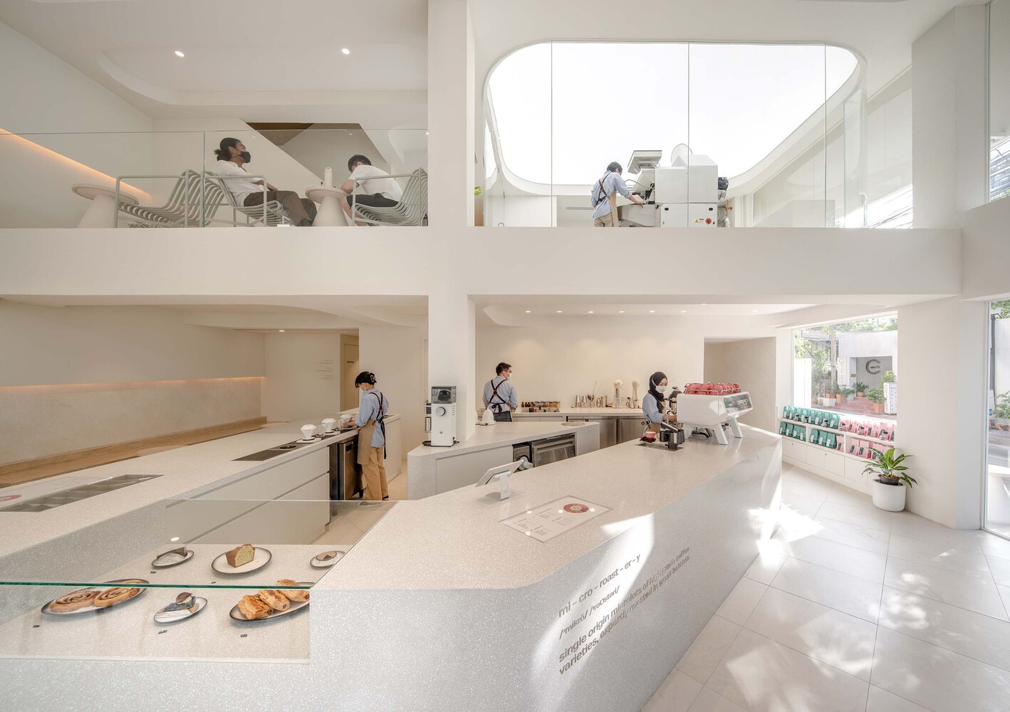 The ground floor is surrounded with glass walls that give a gaze to the atmosphere, the people and the pleasure of coffee. The entrance is placed in a slanted angle, giving new interesting dimension. As consumers step inside, the synergy of modern simplicity and nature can instantly be felt. To resemble the nature of mountain, designer infused the space with texture on the wall, curvy ceiling design, rounded and warm tone furniture; soften the neat white structure. The highlight is a solid surface curvy triangular coffee bar that physically given out more space for baristas to perform and communicate micro coffee culture with customers in friendly proximity.
