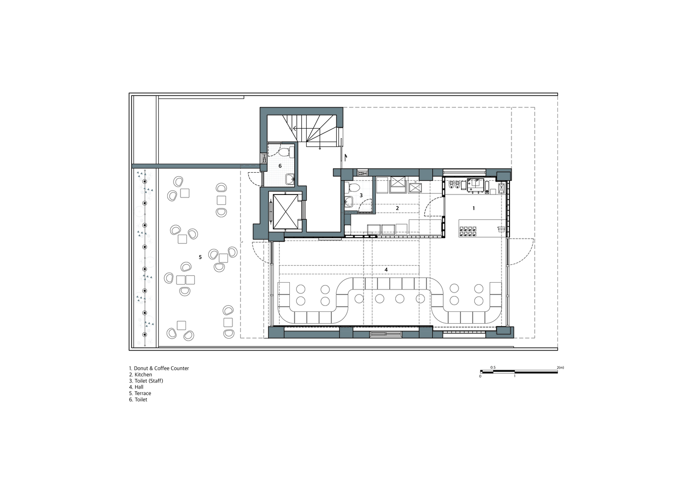 Multi-functional Counter for Overcoming Limited Space - Due to the challenge of designing baking and counter functions (coffee equipment, order, pick-up) in a limited space, the baking rack was embedded into the counter as a way to efficiently work with the flow of employees. By adopting this strategy customers can focus on the doughnut as an exhibition’s object without any unnecessary visual obstacles.