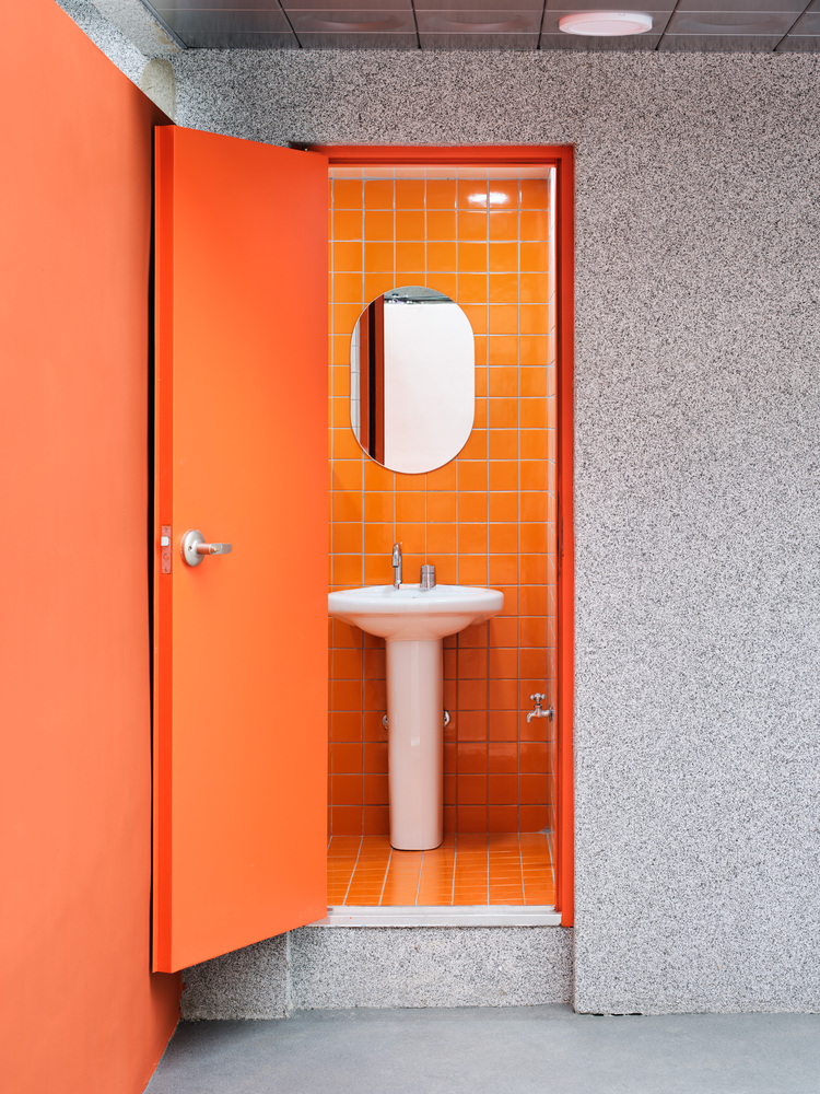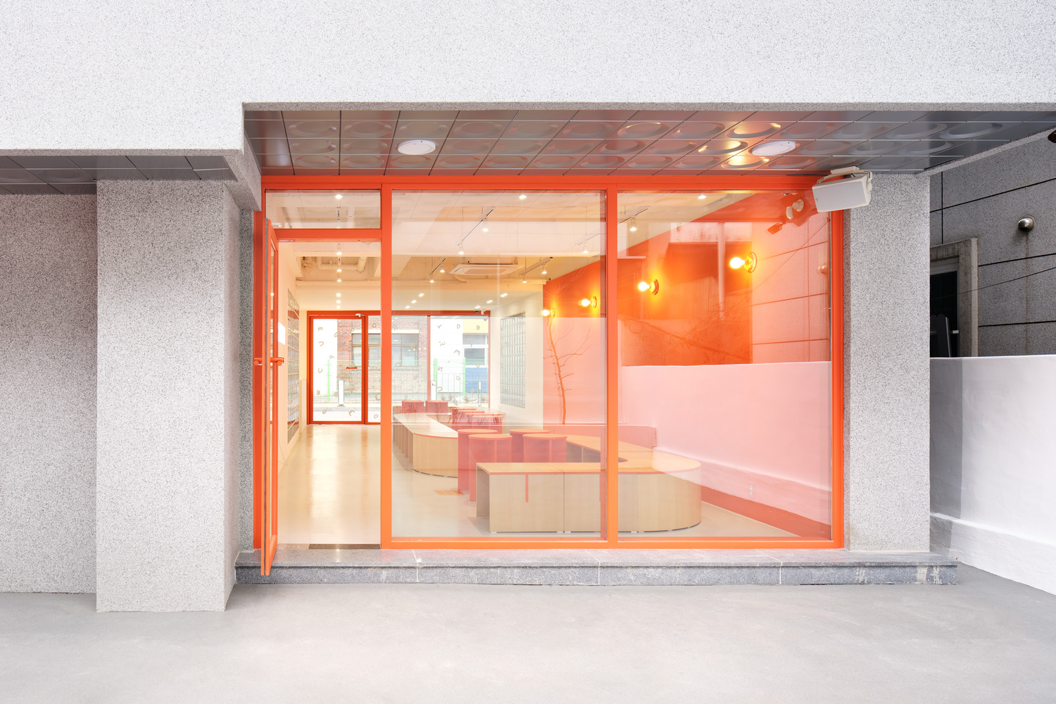 Spatial Sequence through the refined line - The Hall was designed to allow customers to recognize at a glance the path leading from the inside to the terrace. The modular furniture was designed to appear as a single line from beginning at the main entrance until the end of the space that is the terrace. The linear furniture that customers can see wherever they sit plays a medium role to connect the spatial sequence of the outside and the inside. Also, bold colours were used to emphasize the brand image in the interior. Vivid orange, the brand’s BI colour, was applied on the surface of the large wall. Moreover, the installation of the lighting by Joseph Algieri, a New-York based Artist, gives the space an extra touch of an atmosphere reminiscent of ‘filling volume’.