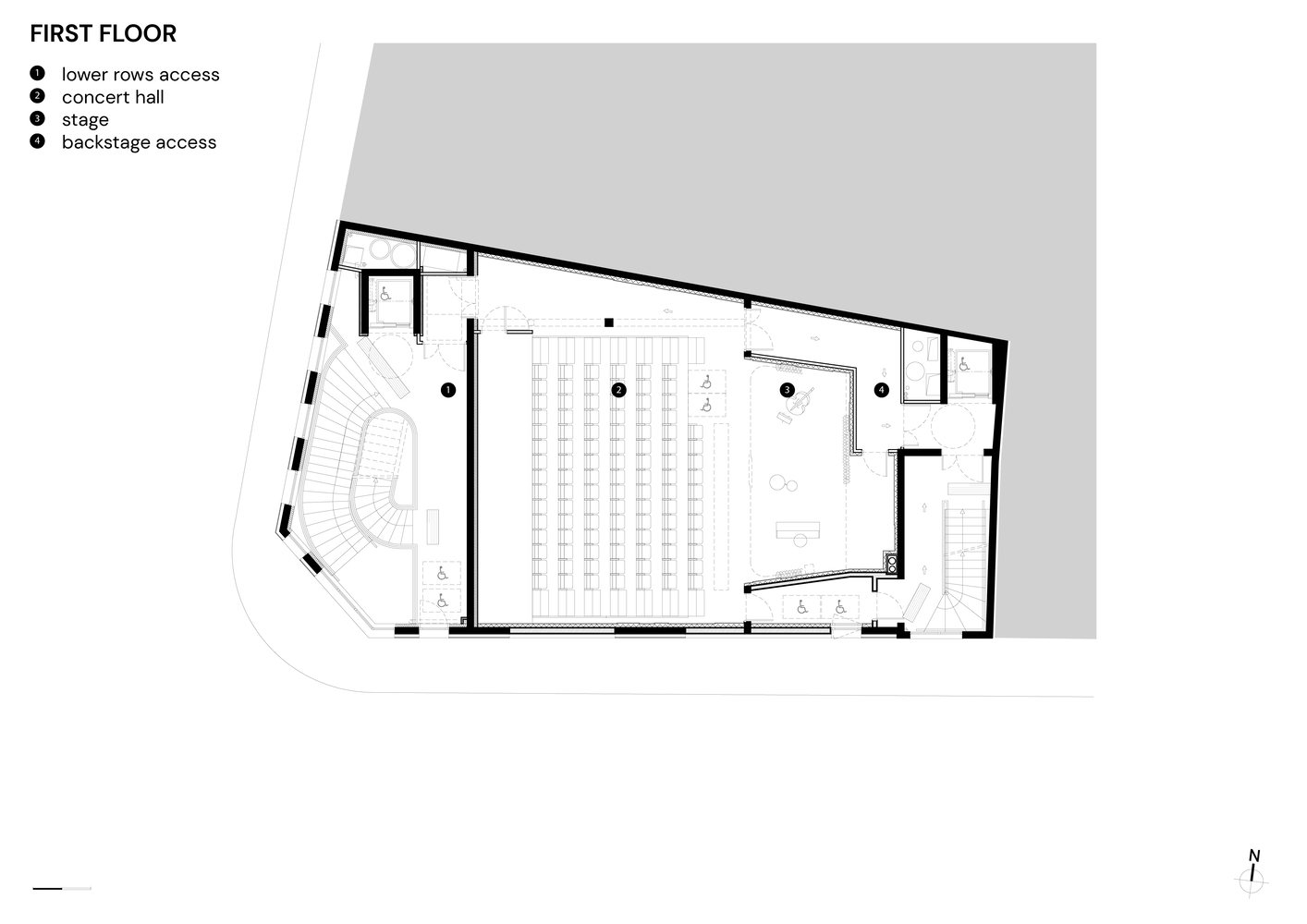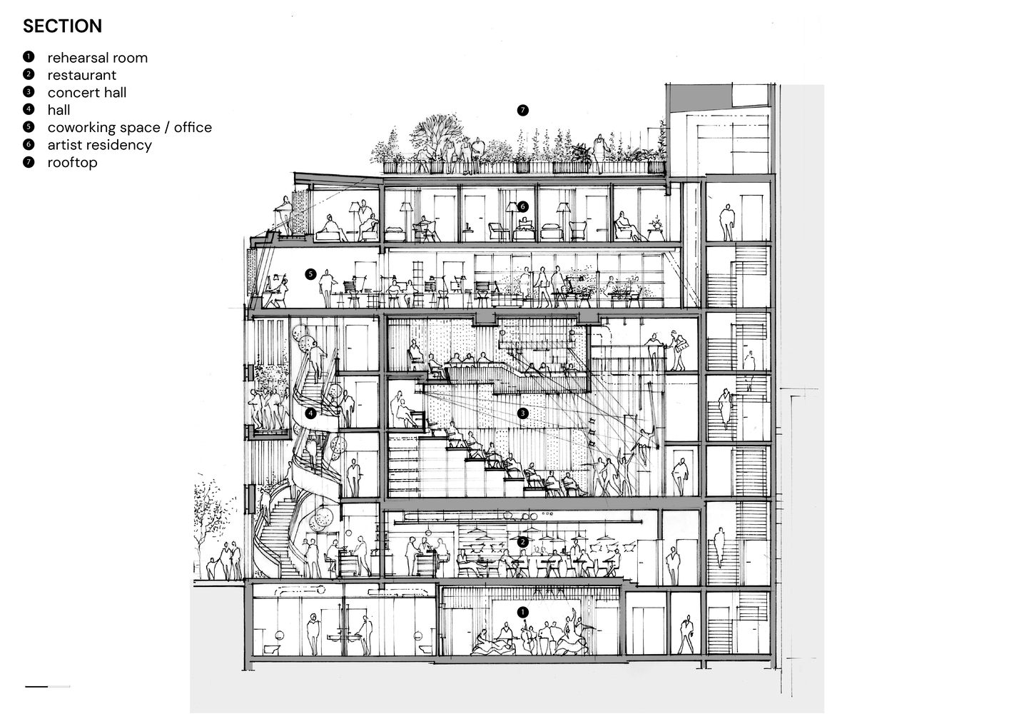 Beyond finding a viable economic model, by making the choice and the bet of grouping different programs together, the result is a particular architectural form that meets all the needs of the project. In addition, the fact of pooling spaces and bringing them together saves money, time, and organization in the process of creating and diffuse the work of artists.