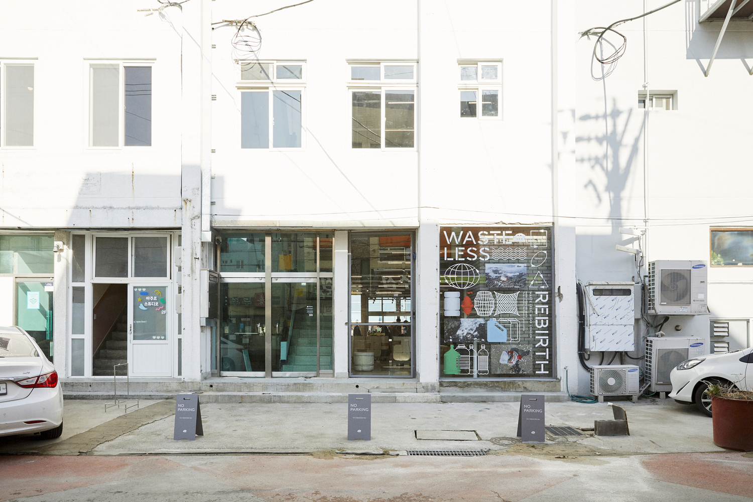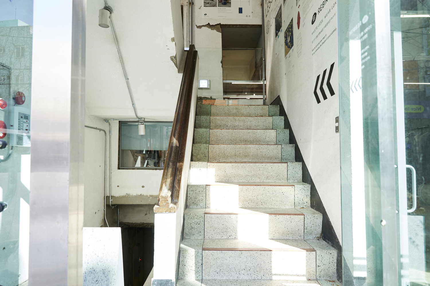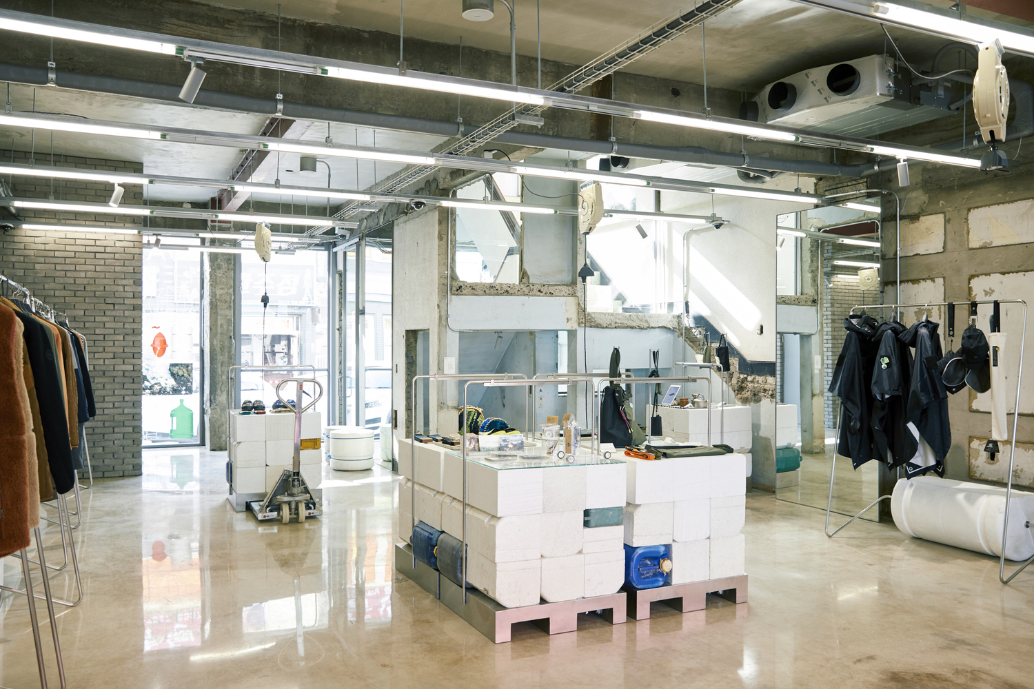 The store is called SOTSOT REBIRTH, an apparel brand based on the concept of sustainability which sells unique items made from recycled materials. We carried on the concept and made fixtures using marine debris collected near the shores of Jeju Island. The existing infill was removed, and the skeleton was used without modification as much as possible.