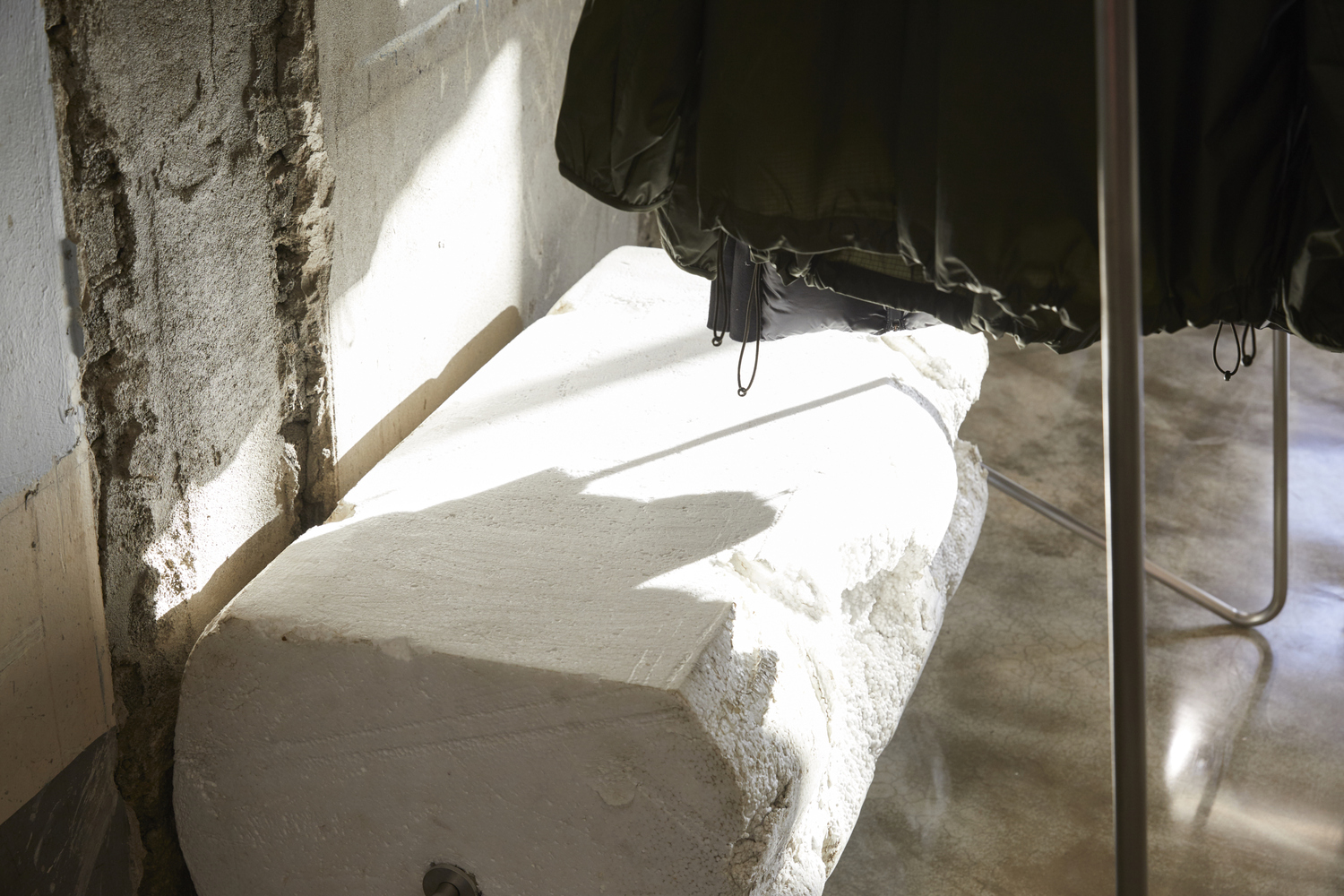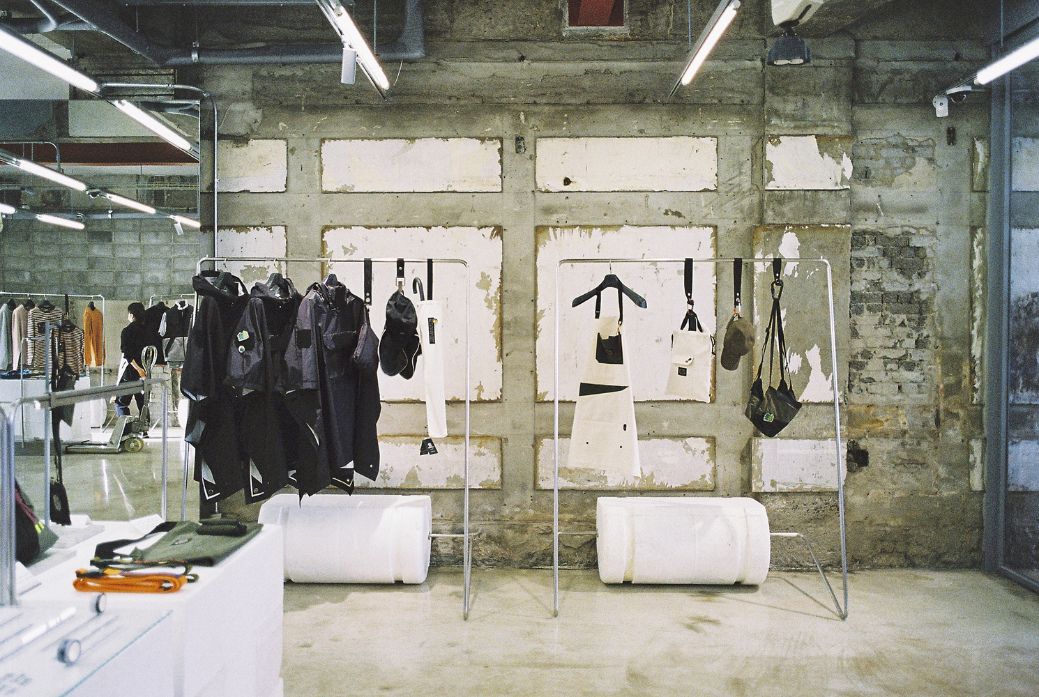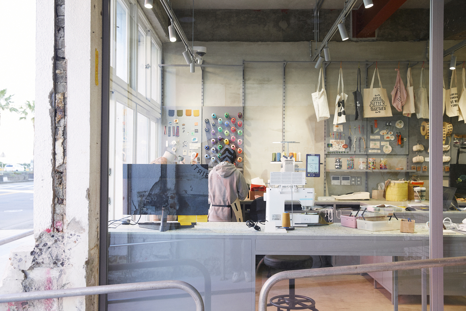The store is called SOTSOT REBIRTH, an apparel brand based on the concept of sustainability which sells unique items made from recycled materials. We carried on the concept and made fixtures using marine debris collected near the shores of Jeju Island. The existing infill was removed, and the skeleton was used without modification as much as possible.