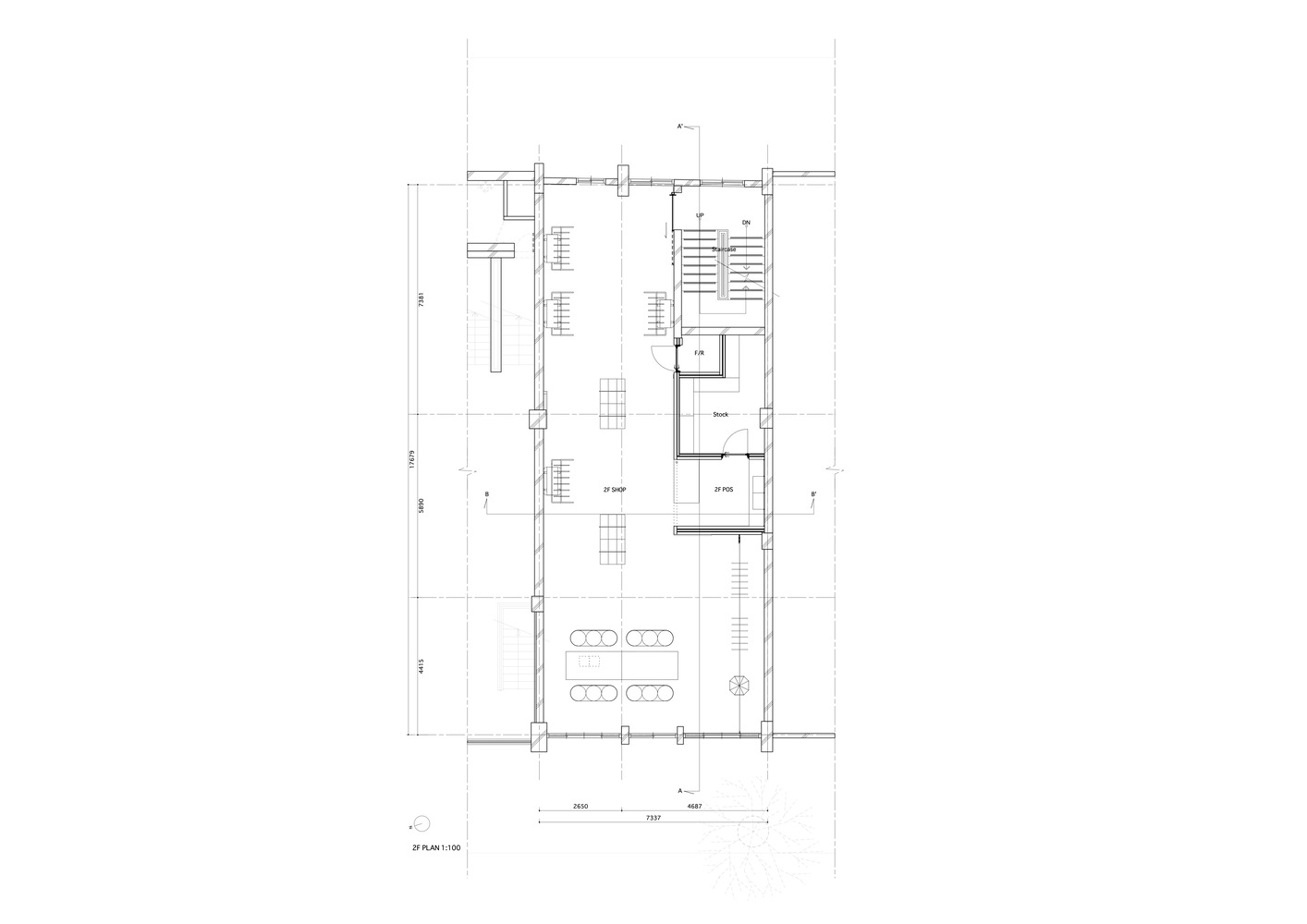 We renovated the first and second floors of the second span from the east side. The existing building was originally divided into separate sections for each span, with signboards between the first and second floors on the exterior wall, like a typical shopping street. We thought that the current state of the building would prevent us from creating a unique appeal of the " invisible development" that could be only perceived once you go inside.