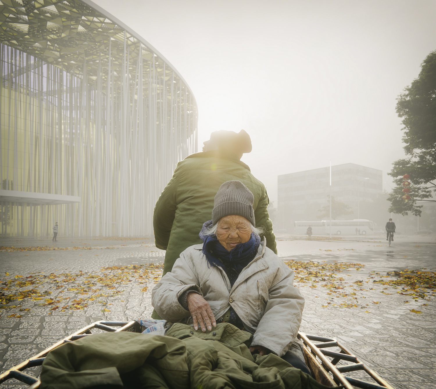At night, the building envelop is illuminated from below, becoming an ethereal beacon, glimpsed between the forest of ‘bamboo’ columns, drawing spectators and audience in from across the lake and surrounding development.