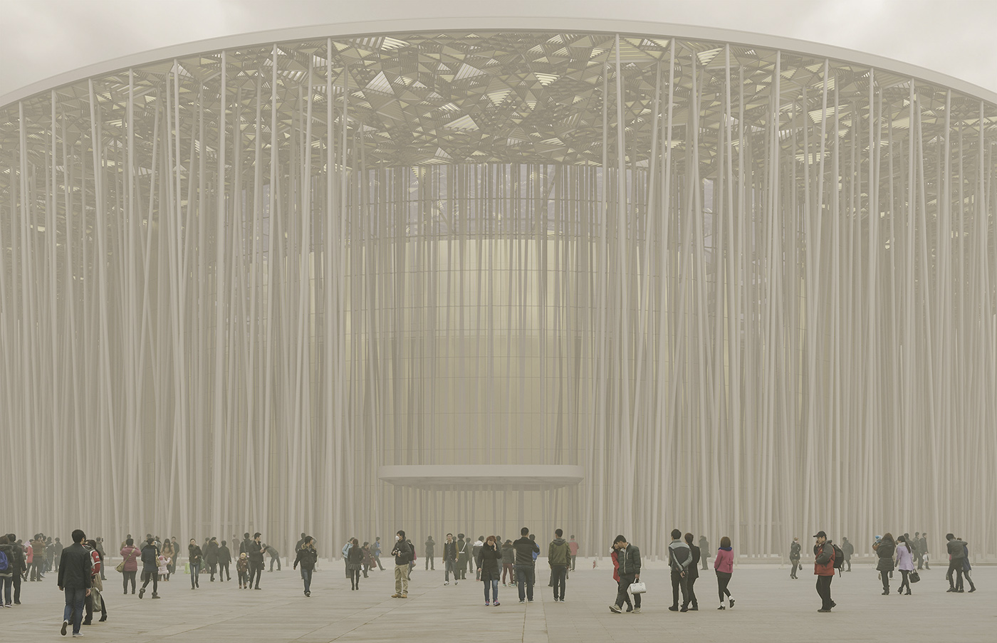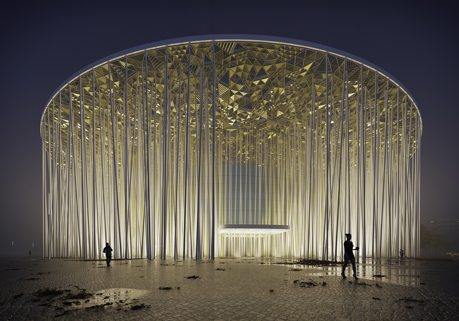 Located close to Lake Taihu in Jiangsu Province, China, the Wuxi Show Theatre concept was inspired by the Sea of Bamboo Park in Yixing, the largest bamboo forest in China. The 2000 seat theatre has been designed to house a permanent water show by Franco Dragone and it is due to open in 2019.