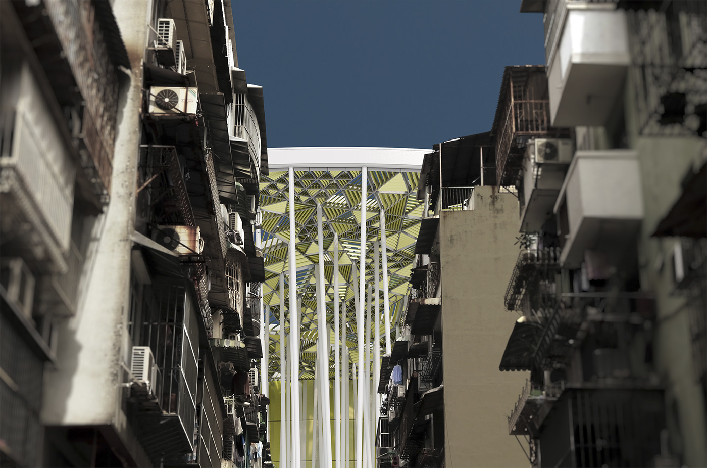 “대나무 숲의 추상적인 인상을 나타내는 가느다란 흰색 기둥은 건물 외관과 주변 풍경 사이에 스크린을 제공하는 방식으로 건물 둘레에 위치합니다. '대나무' 기둥은 건물로의 접근을 구성하는 데 도움이 되도록 다양한 입구 주변을 깨끗이 합니다. 차양 캐노피는 지붕 수준에서 건물 둘레를 감쌉니다. 개념적으로는 대나무 숲 꼭대기에 존재하는 나뭇잎의 캐노피를 나타냅니다. 캐노피는 금색 양극 처리된 알루미늄 루버 행을 포함하는 다양한 삼각형 베이로 구성됩니다. 각 베이는 하루 종일 건물 외피를 가로질러 떨어지는 구조와 조명 및 음영 패턴에 유기적인 품질을 만들기 위해 무작위로 방향을 지정합니다.