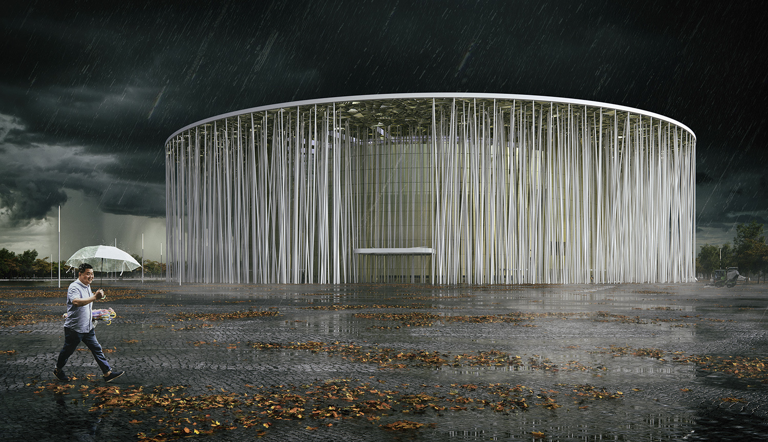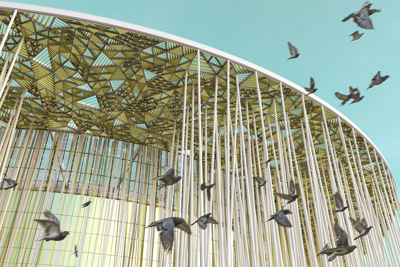 Representing an abstract impression of a bamboo forest, the slender white columns are positioned around the perimeter of the building in such a way as to provide a screen between the building façade and surrounding landscape. The ‘bamboo’columns clear around the various entrances to help frame the accesses into the building.
