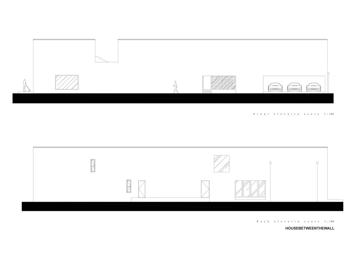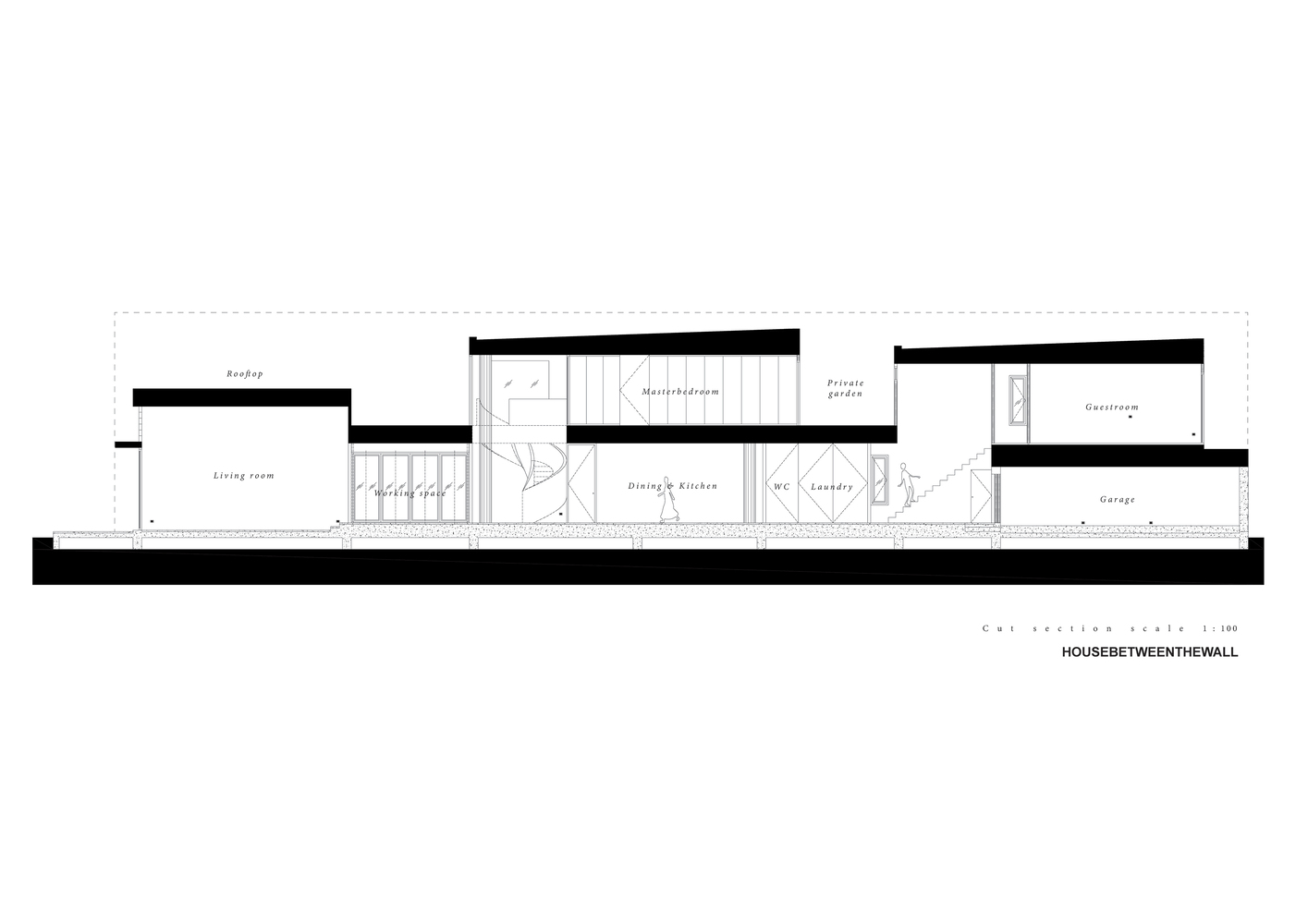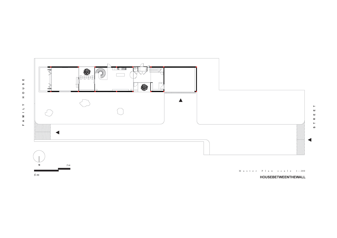 House between the walls concept idea came along with the restriction of the site context which provided a long rectangular shape place beside the street on the property. The facade of the house looks bold and solid in the simple form of the box to prevent the sight approach around this area but on the opposite, it makes the interior space scenic and relaxed by the result of privacy and lighting effect.