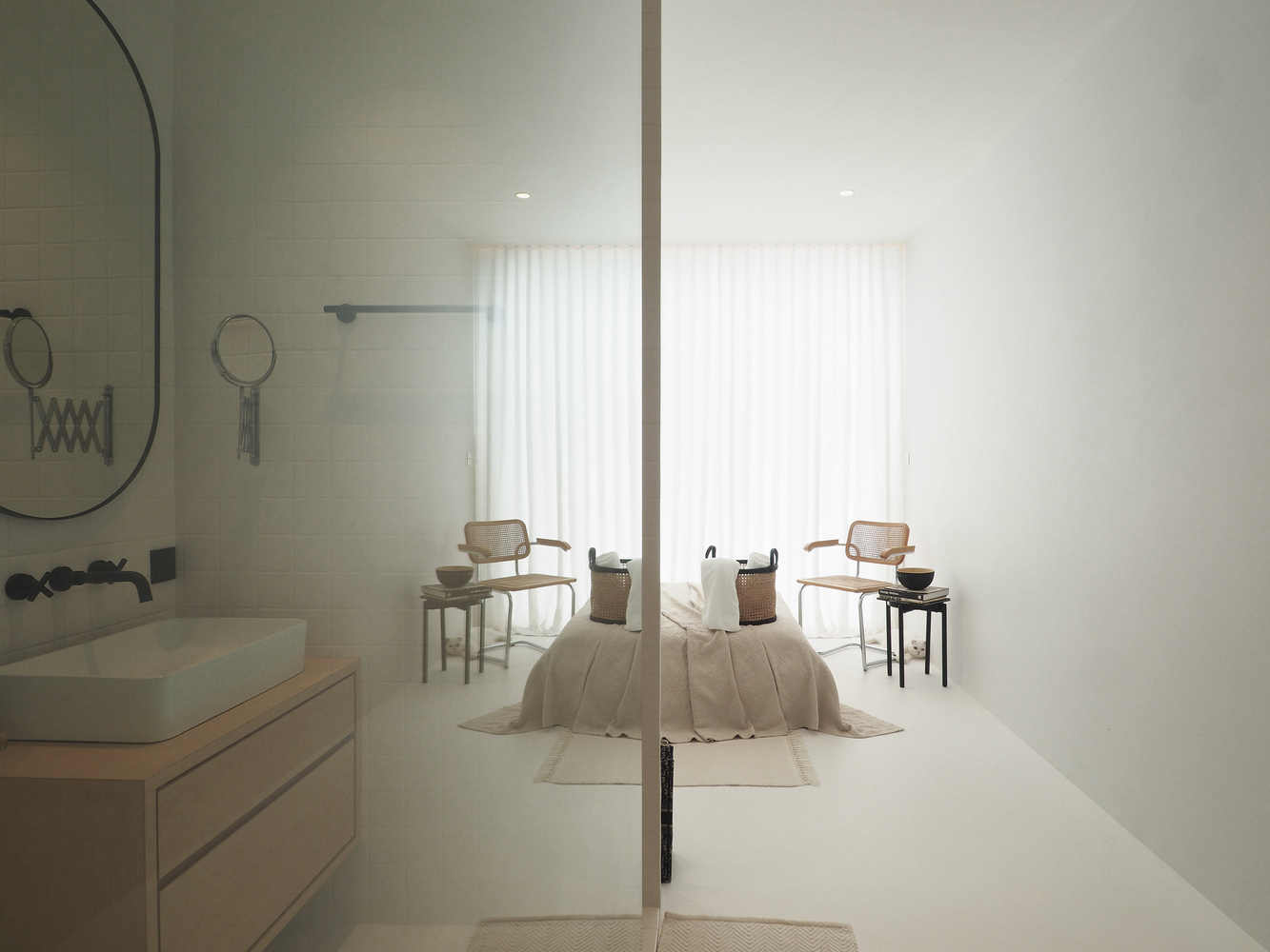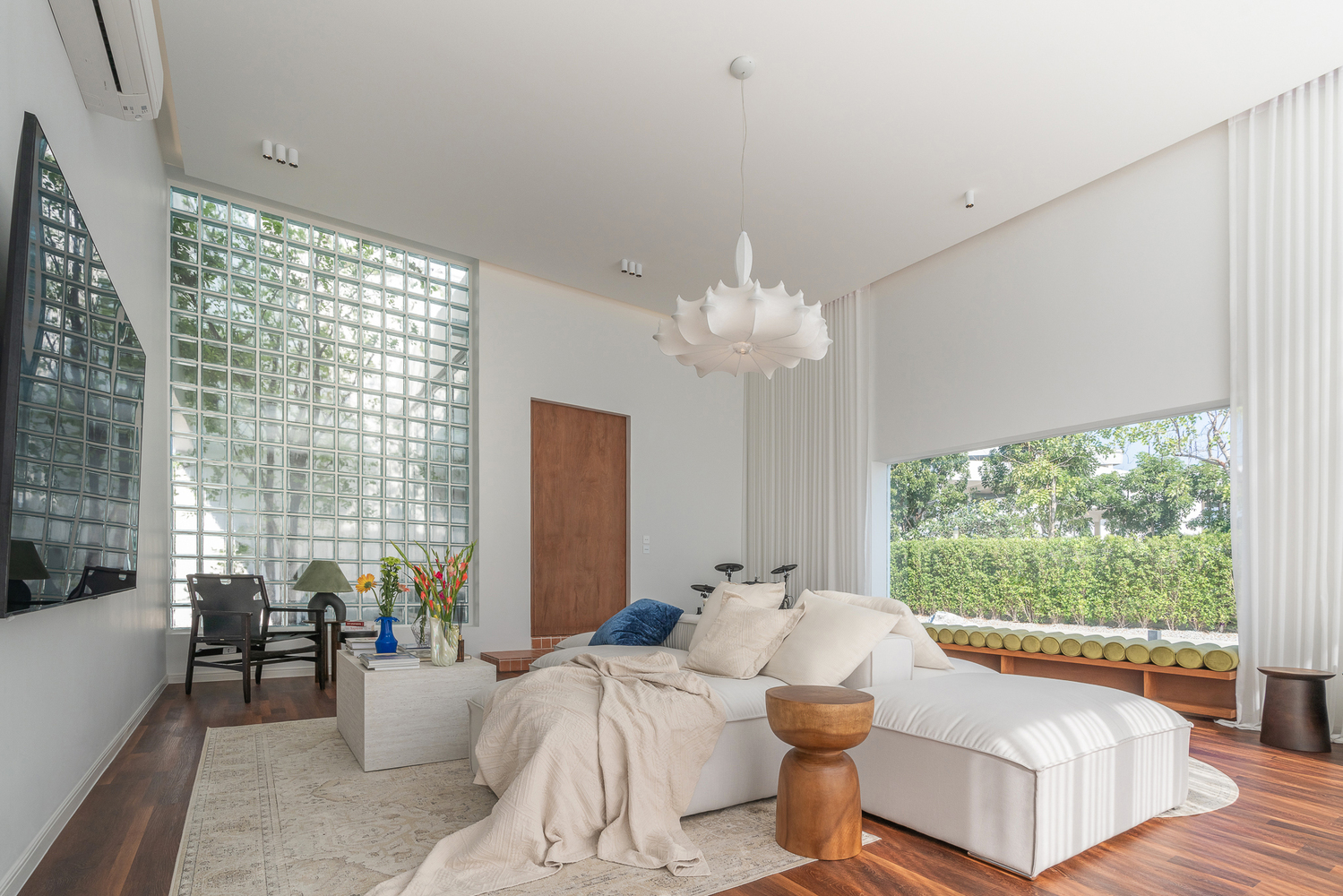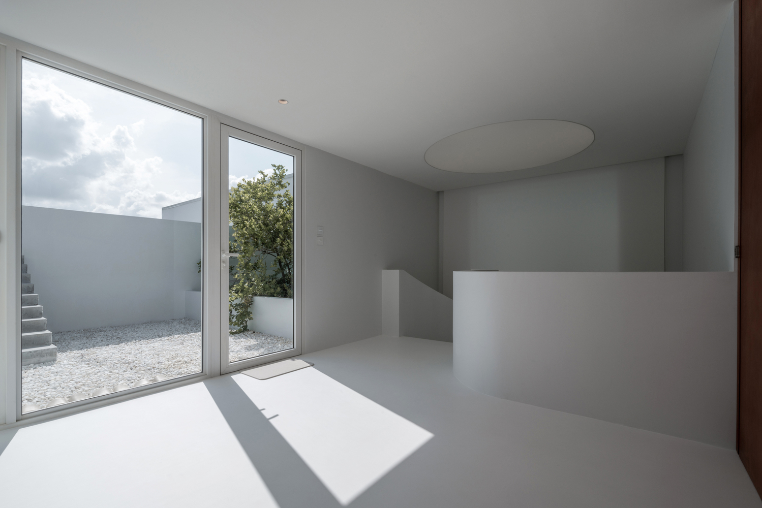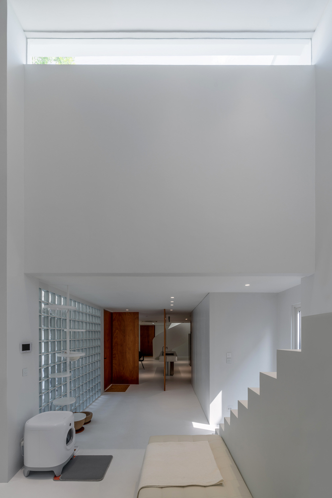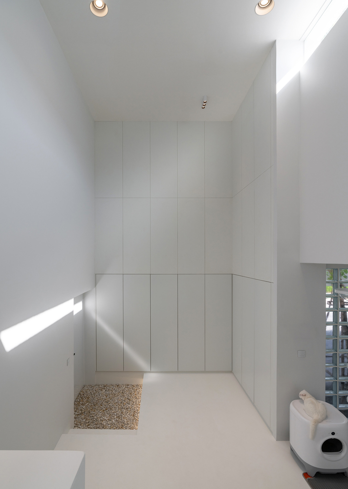Each door and windows design indicated the purpose of lighting, sightseeing, and ventilating to the interior space in a matter of time. we want to reach the interior language into a minimalistic yet warm and heimish-like house gallery shape with the natural light on this large white canvas. After entering the house, the interior space is welcoming by all white space, calming the feeling of busyness outside the wall. Evoking the simplicity of the interior atmosphere. All-day natural light passes through the glass block with indirect light which avoids the heat radiant into interior space.