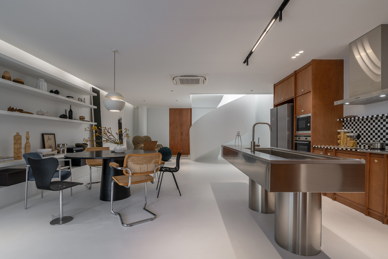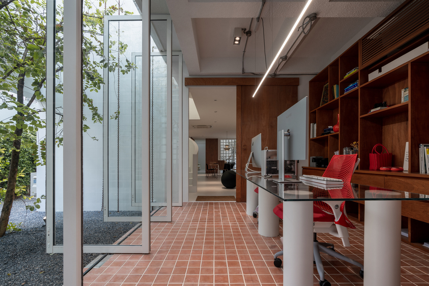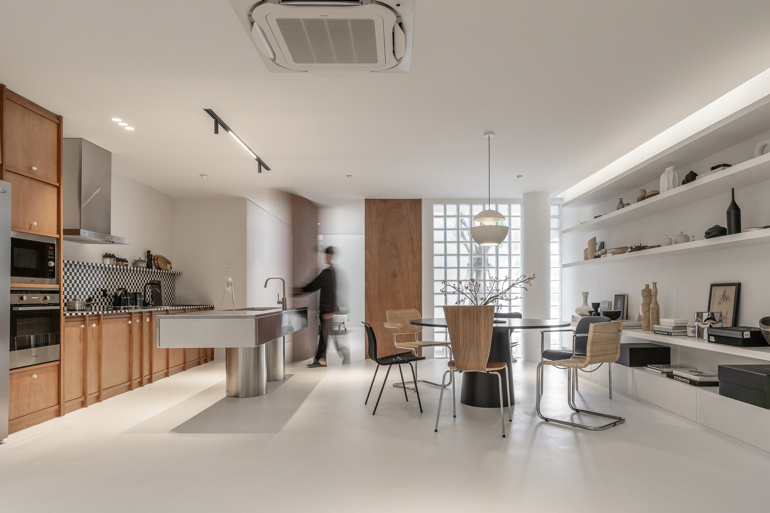 The plywood pivot door divides the open space planning occasionally. The main kitchen and dining area initiates the sense of craftsmanship by the checkered pattern kitchen contrast with plywood cabinet and gastronomy objects. On the opposite side, the collection of books and art objects creates the recreation corner of relaxation. The interior appearance goal has reached into the mid-century element based on the pure simplicity of white gallery space which assists the appealing of comfortable living.