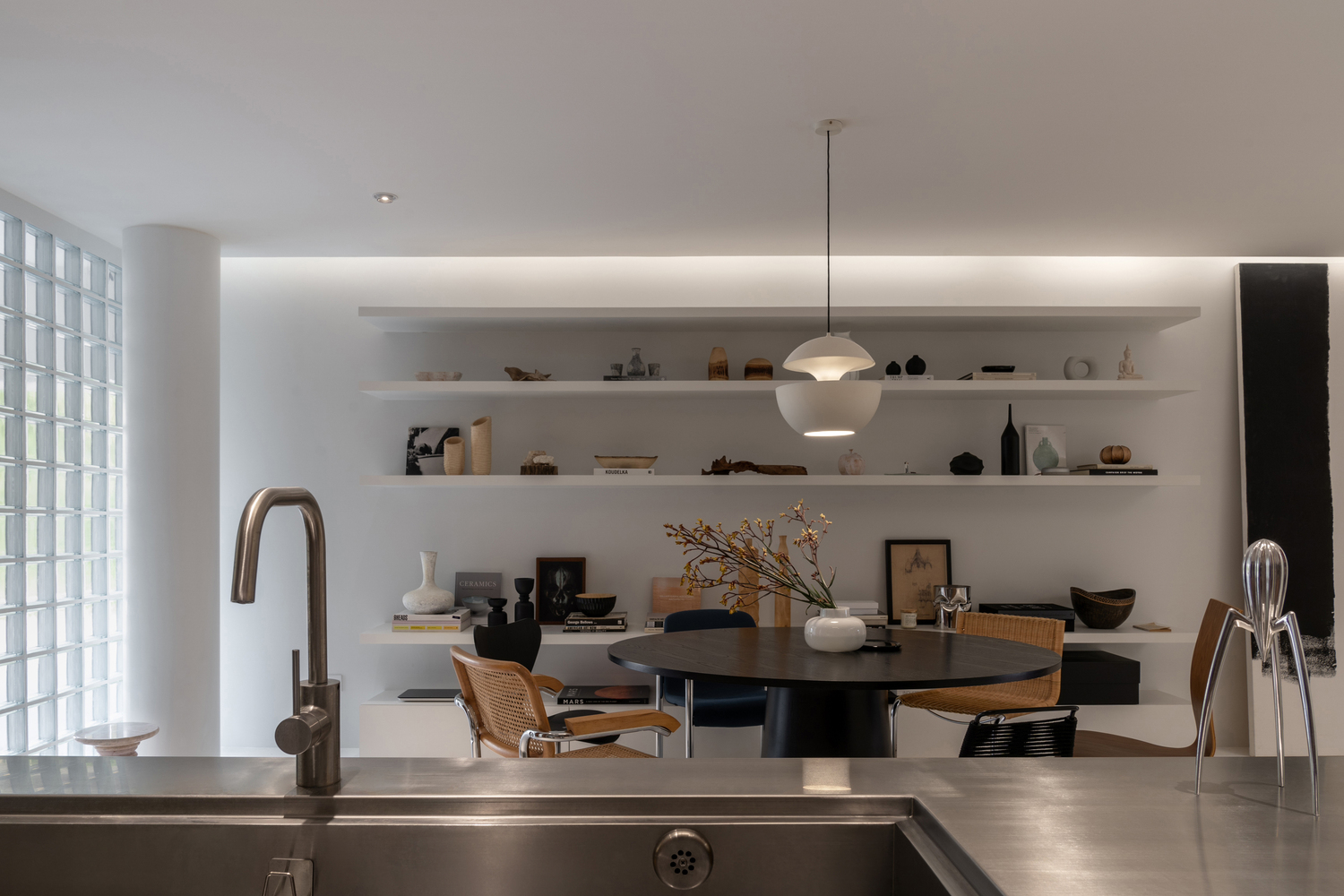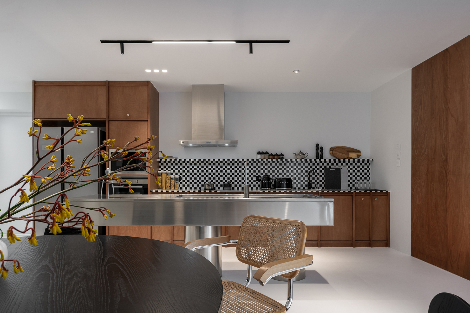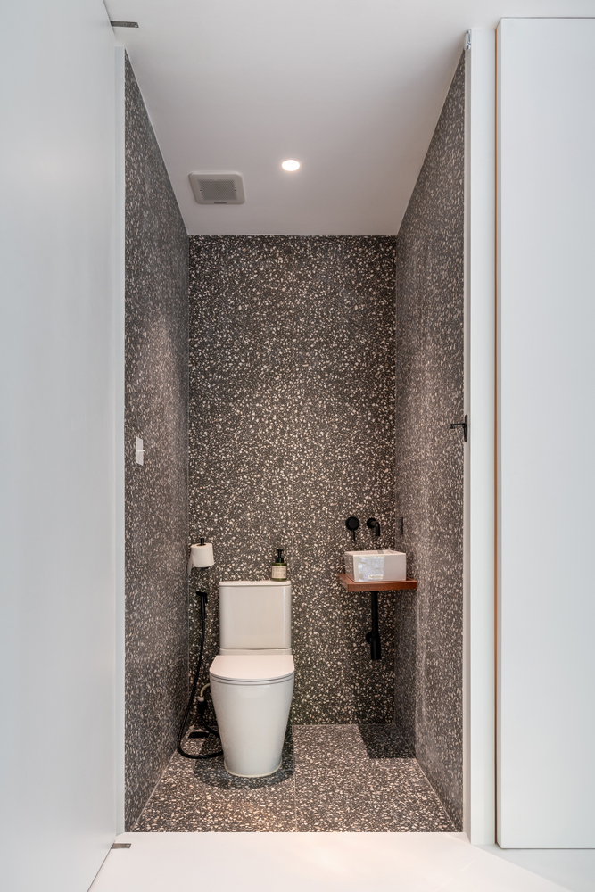 The plywood pivot door divides the open space planning occasionally. The main kitchen and dining area initiates the sense of craftsmanship by the checkered pattern kitchen contrast with plywood cabinet and gastronomy objects. On the opposite side, the collection of books and art objects creates the recreation corner of relaxation. The interior appearance goal has reached into the mid-century element based on the pure simplicity of white gallery space which assists the appealing of comfortable living.