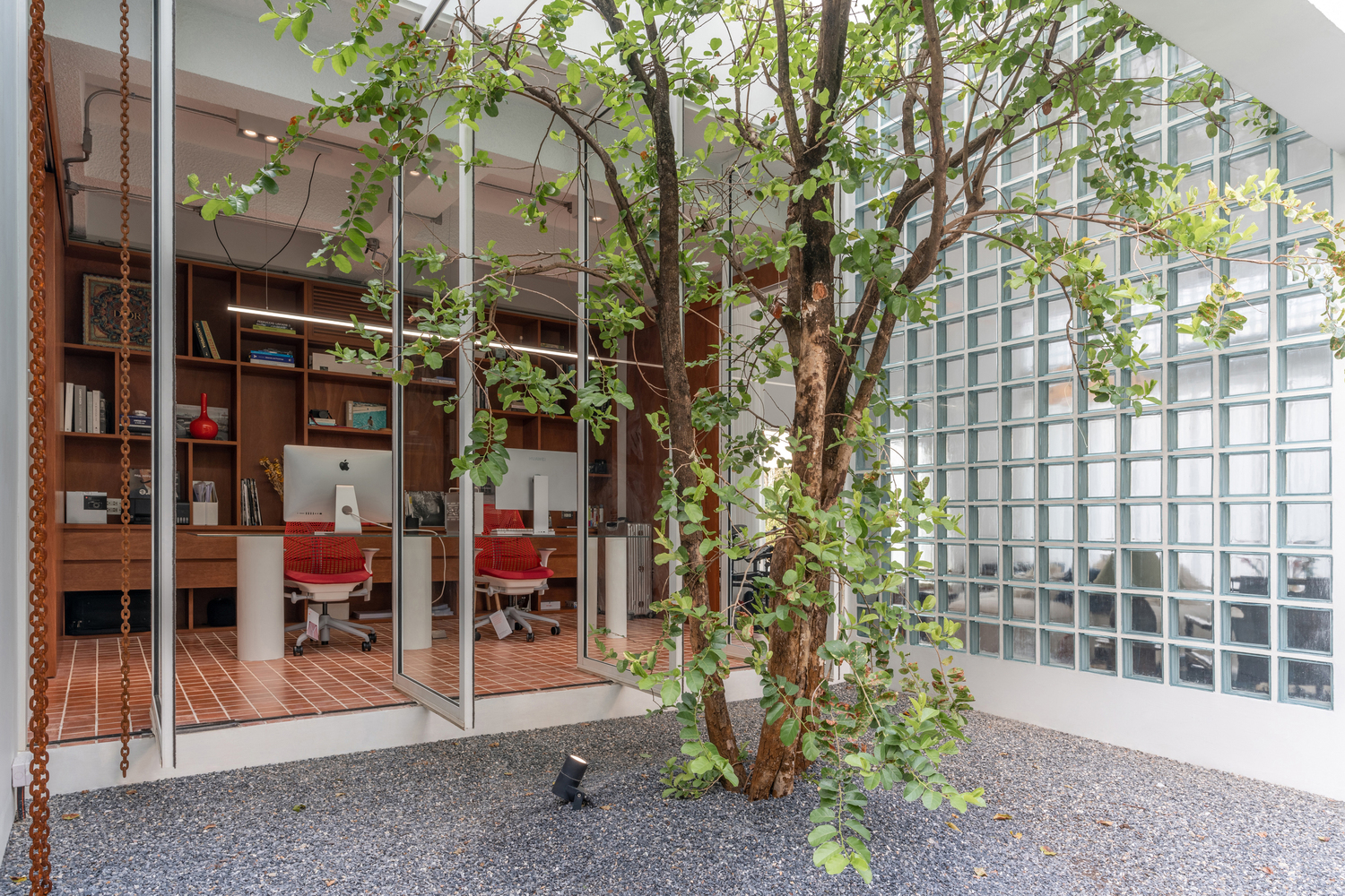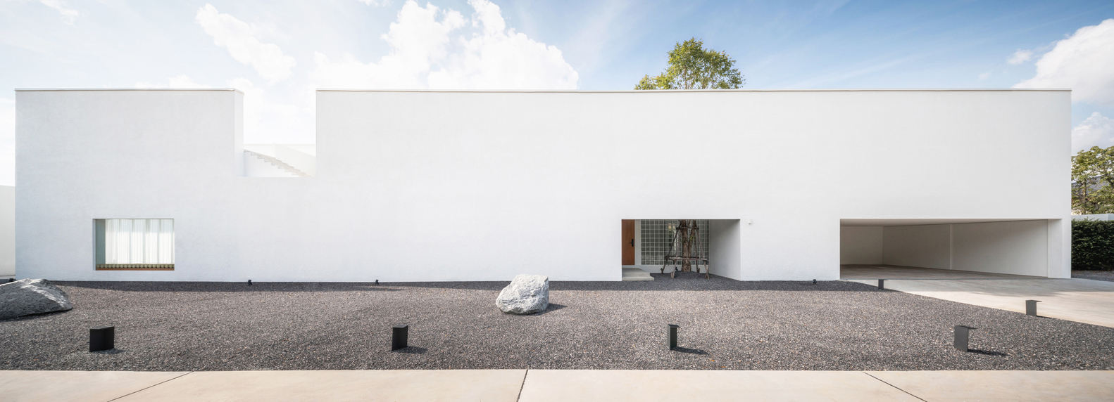 The finishing of the wall cladding is made from elastic texture paint to prevent wall cracking in the future and also conceal the irregular surface which might be caused by climate change. Total space contains 260 sqm. of interior usage and 140 sqm. of exterior path and greenery. With 40m long of 2 main walls, we separate the interior space into 2 wings for Guest living and the host. The potential of long length space gives the social distance of circulation to the users in the house with the flow of connected programming which we can choose to open or close. Both 2 wings contain a large tree in the middle of each space which we can see at every angle from where we stand and every floor we are living on by only 2 specific trees.