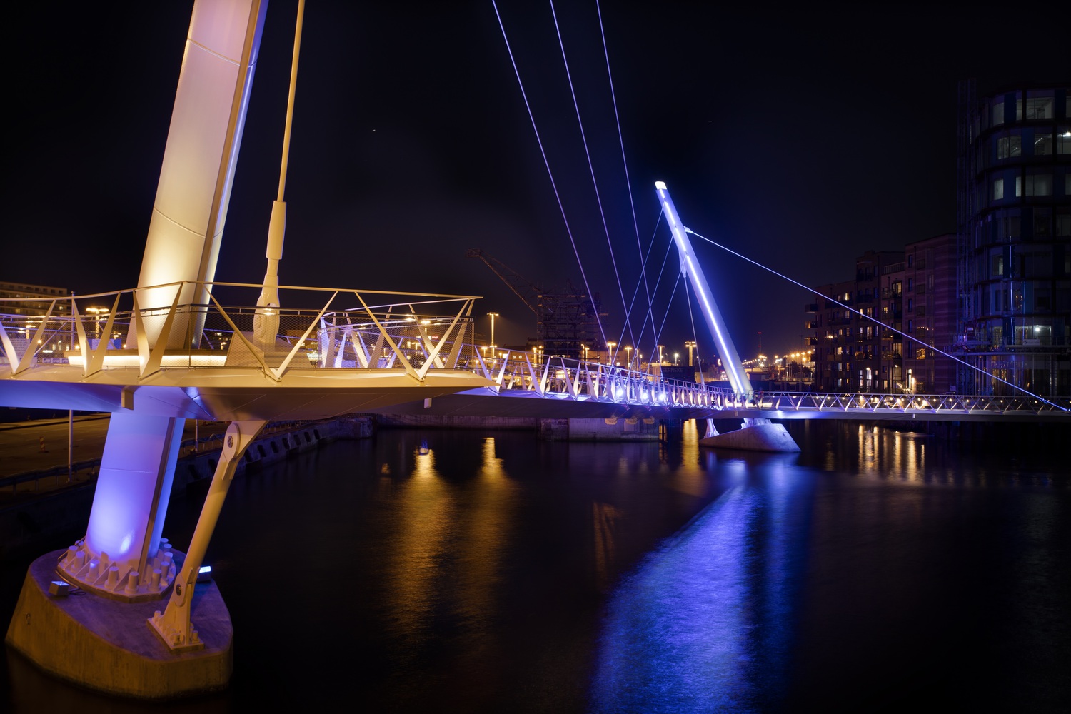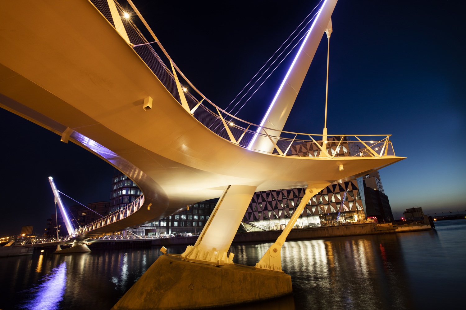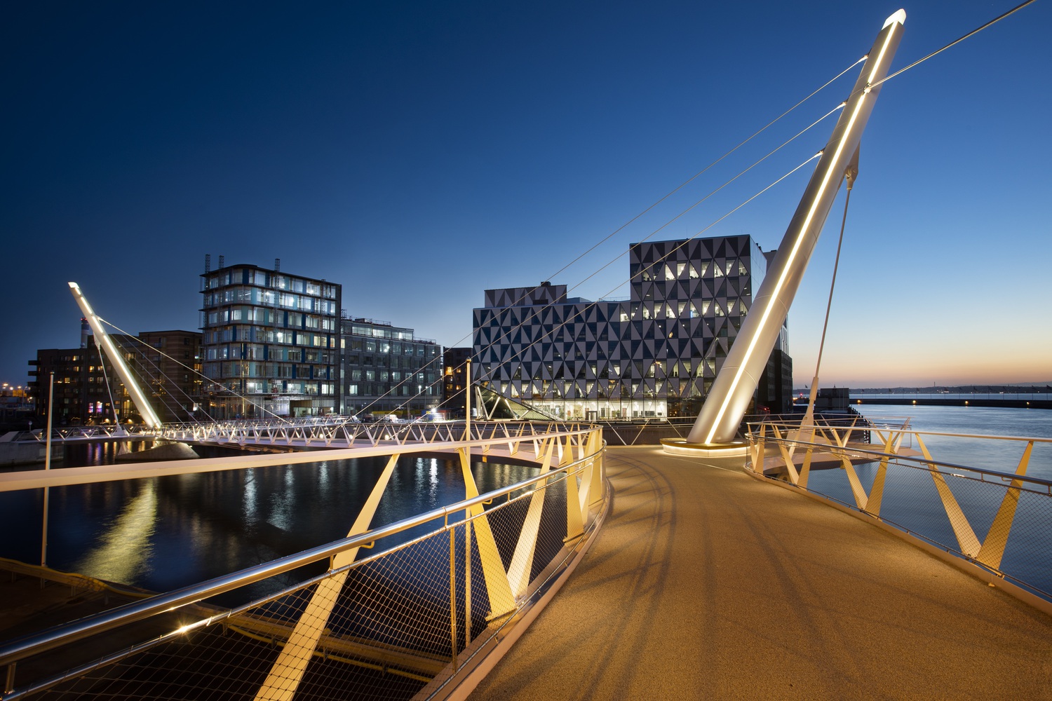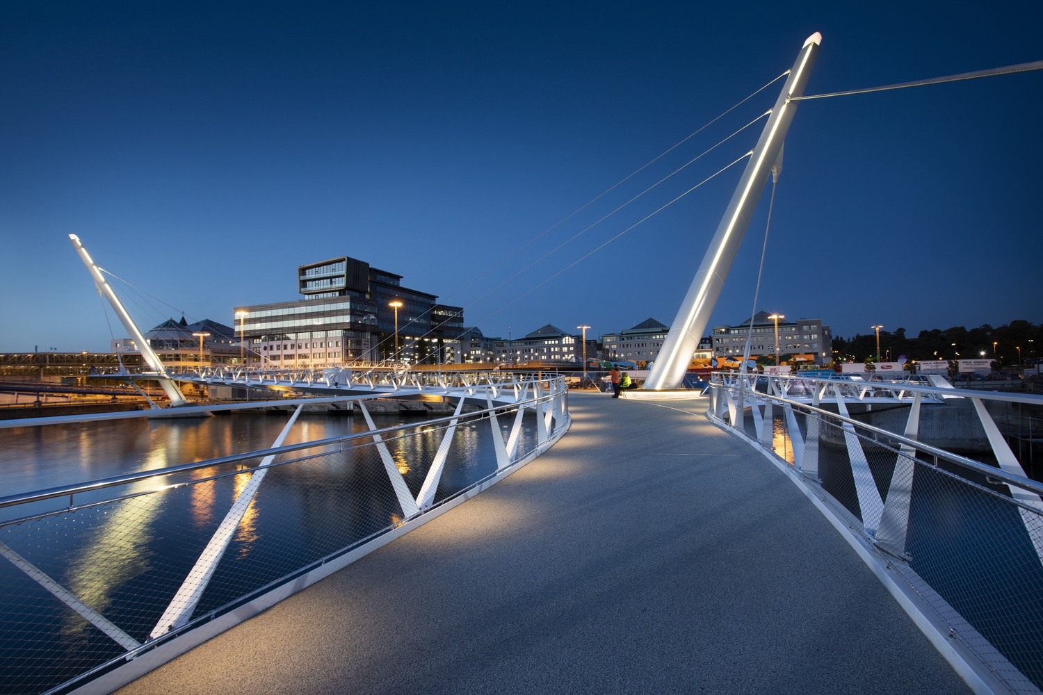 The deck is supported at its mid-span, over the water, by three cables hung from two oppositely inclined pylons which provide the main focal points for the bridge. However, rather than simply connect to the deck edge, as is usual with a cable-stayed arrangement, these cables swoop beneath the deck to cradle it from below and emerge on the other side, rising to the opposing pylon in a dynamic and bold expression of the cable-supported bridge form. Four further cables, two at each mast, stabilise the bridge and anchor the masts to the ground.