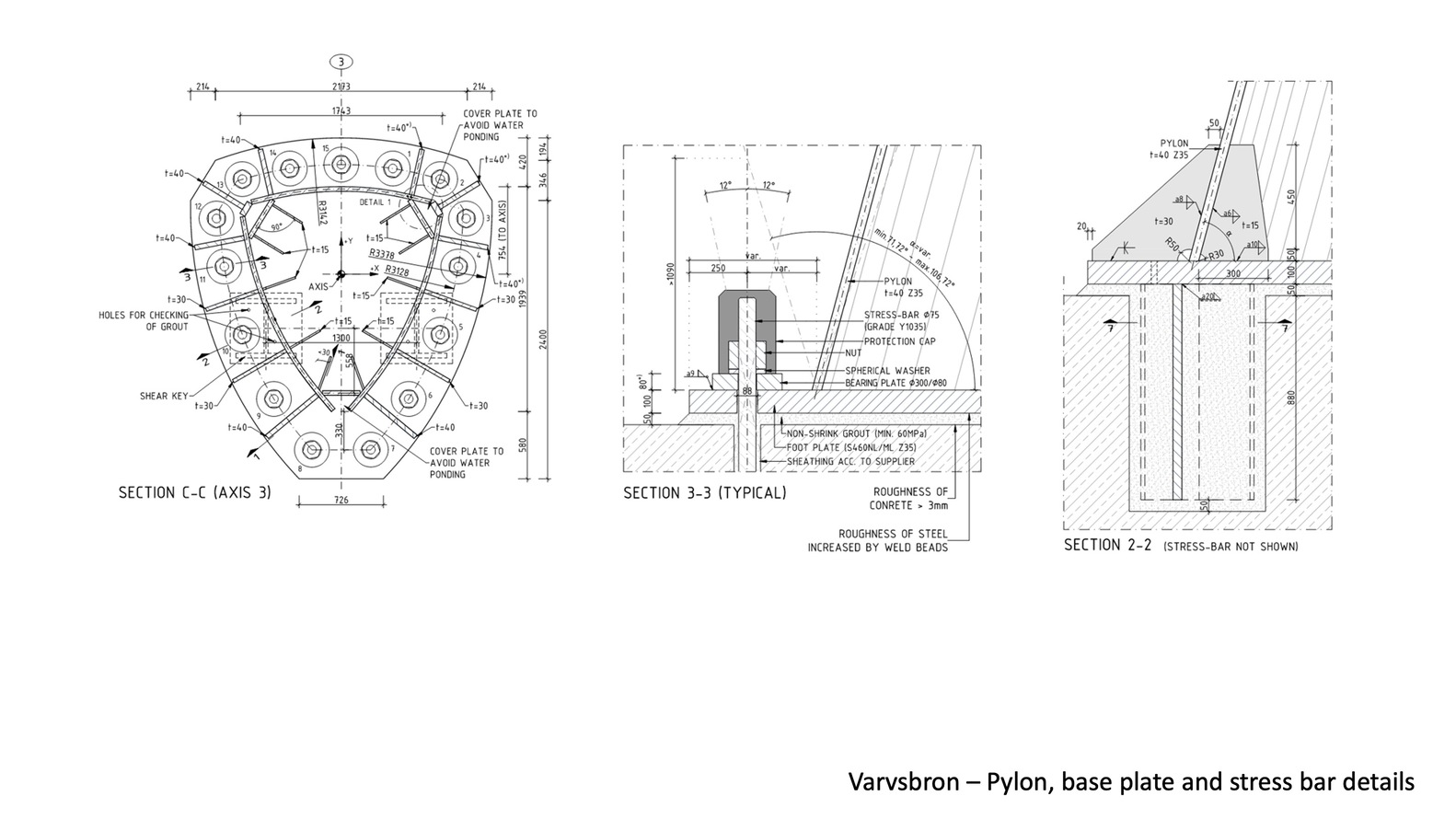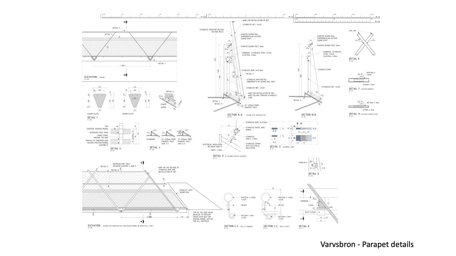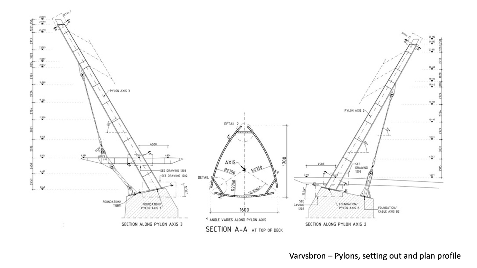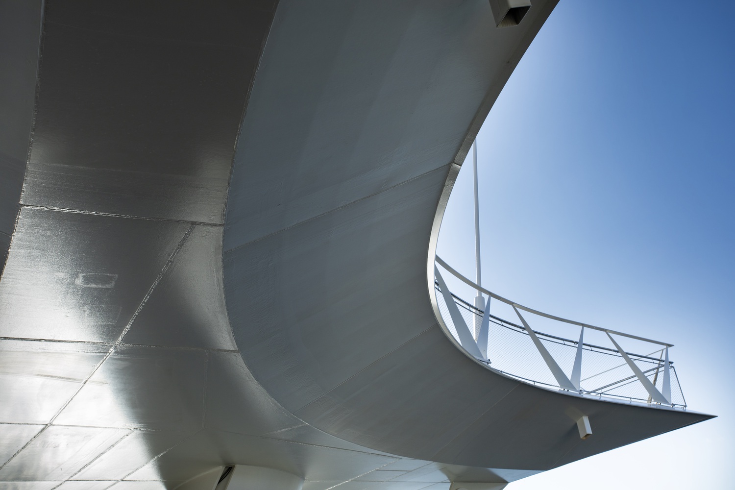 Each inclined pylon rises 23m above the deck and is formed from an extruded ‘teardrop’ steel box section, tapering as it rises toward a light beacon at its pinnacle. The three primary cables are 70m dia locked coil cables, connected within, and emerging from, the pylons at high level. The bridge deck itself is a trapezoidal steel box section, fabricated from painted steel, and stiffened both longitudinally and transversely. The parapet is a bespoke stainless steel system of V-supports, widely spaced along each edge, with a woven mesh of stainless steel, following the curve of the deck, providing the infill.