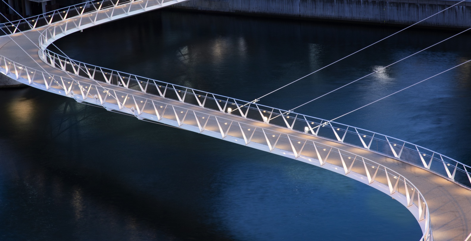 The new bridge is much more than a simple route, it both helps to shape public space and has proved to be a popular destination itself with areas designed to promote positive interaction between users. At each pylon, the deck branches outward to create two complementary cantilevered spaces: one, a remarkable viewpoint over the busy ferry channel to the north, the second offshoot forms a ramp touching down lightly on the new park to the south.