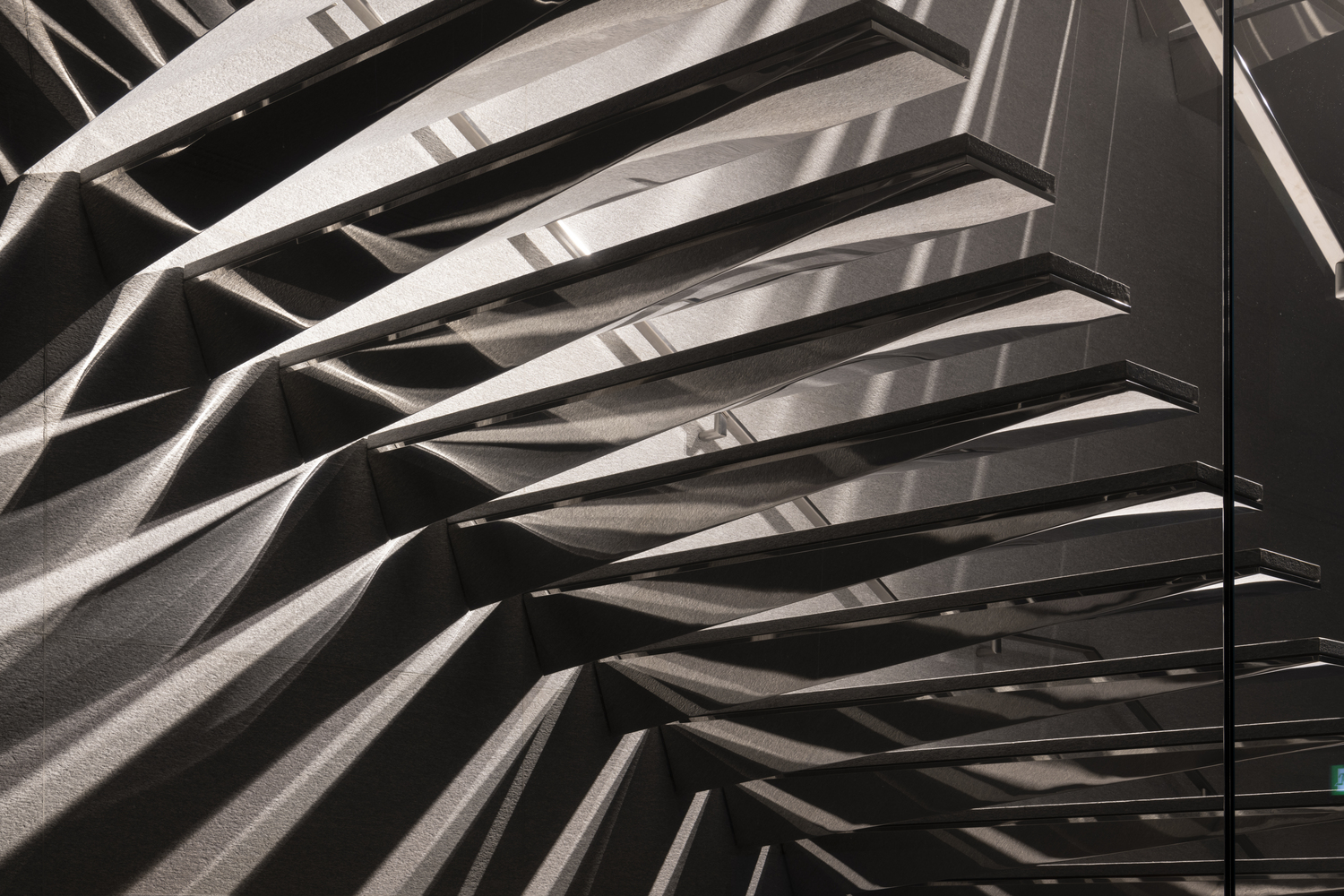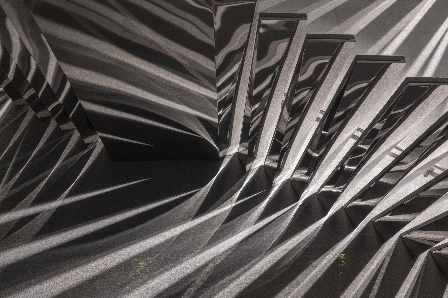 The interior is a bright, monolithic space, metaphorically carved out of the same stone as the plaza above. The ceiling follows the stepped profile of the amphitheater, with skylights and backlit ceiling panels that innovatively combine artificial and natural light. Through the roof and stairs, warm shafts of sun penetrate deep into the sunken store, connecting the interior with the light and rhythm of Milan and giving it a feel of a spacious daylight-filled art gallery. The stairs leading into the store consist of polished stainless-steel clad cantilevering treads that also become a sculptural light installation, creating a theatrical and exciting experience.