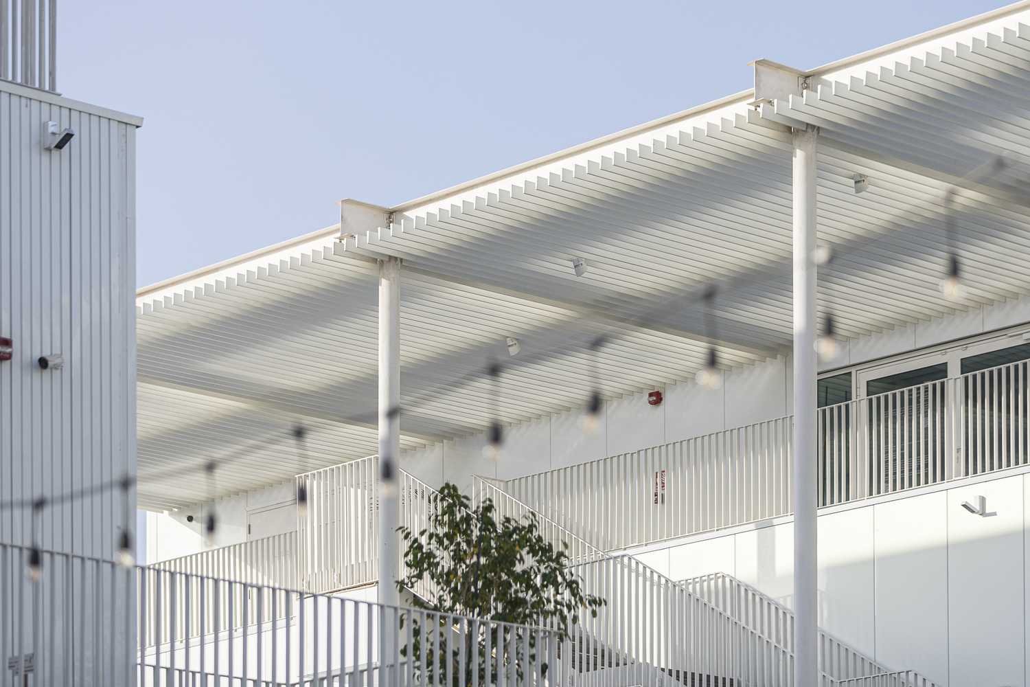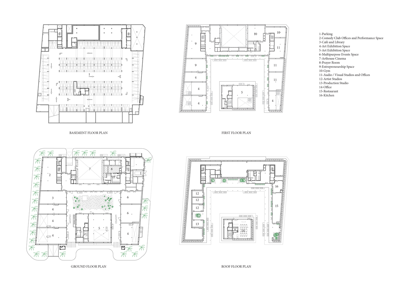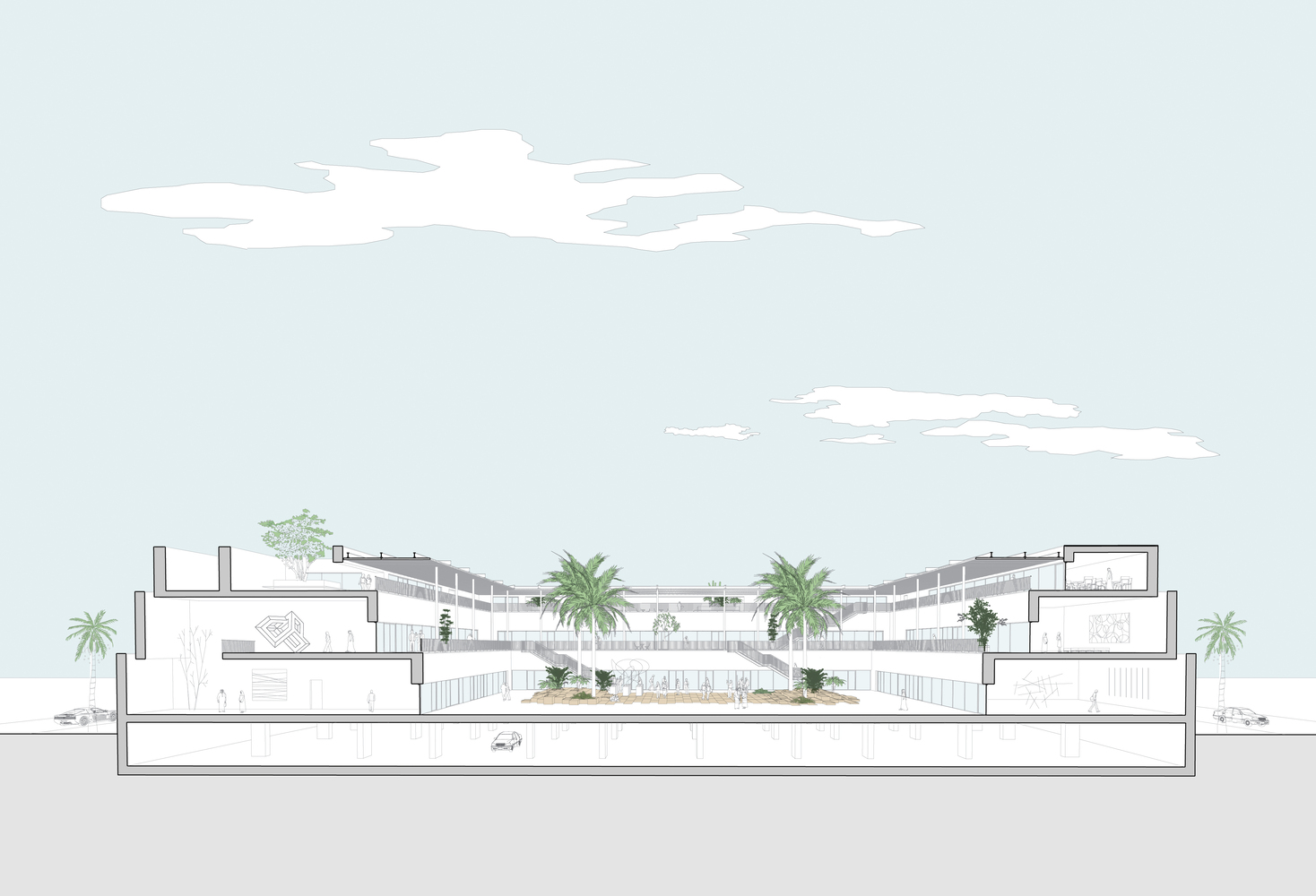 waiwai the architects of the project explain that fundamental to the project is the main central courtyard, which acts as the driver of the architecture and the programmatic heart of the community. On the building’s upper levels, the courtyard is surrounded by shaded, staggered terraces that serve as extensions of the courtyard, and allow it to be conceived as a spatial whole that connects every level of the project. On the ground floor, the courtyard is enhanced by seating among natural greenery. With its strategic placement in the programmatic arrangement, the courtyard's central position provides direct, continuous connections to the architecture's services: art exhibition spaces, media offices, performance venues, cinema, library, artist studios, restaurant, commercial art vendors, and community-focused multi-purposes spaces.